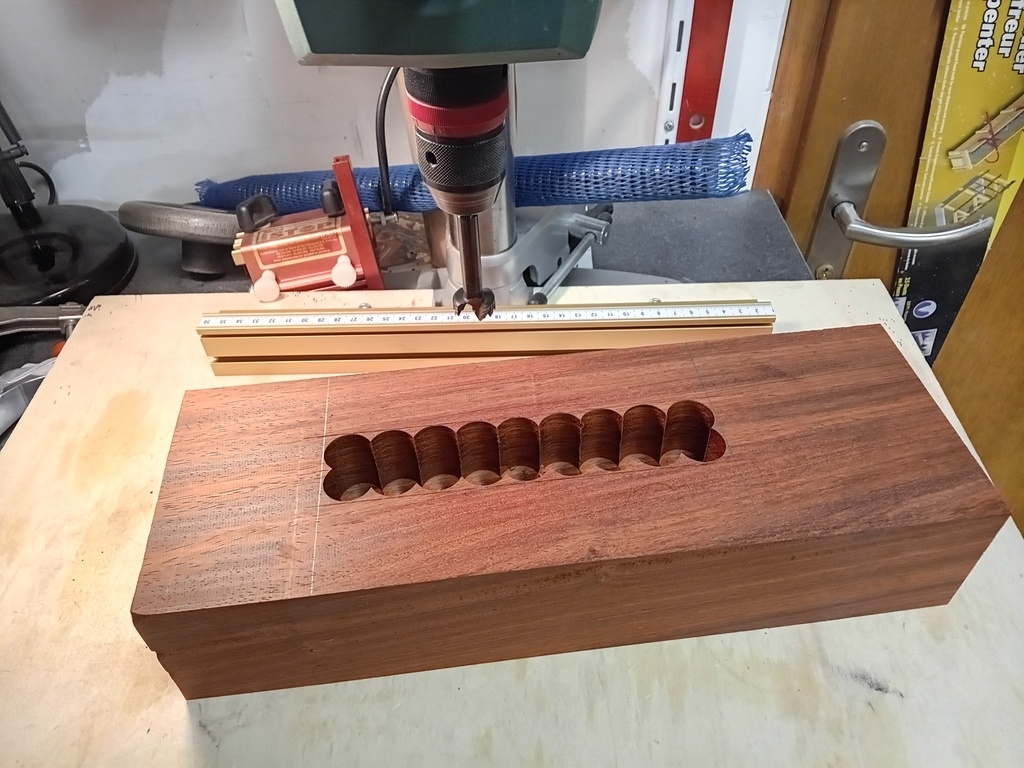 J'ai la flemme de faire des essais alors je vais assembler avec des chevilles en hêtre que je vais enfoncer deux trois millimètre de plus et y coller un bouchon en padouk.
