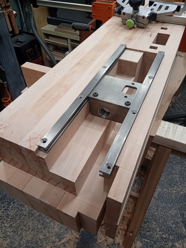 Le bloc se monte dans les glissières du piètement, deux pièces en padouk font office de butées et deux identiques à l'arrière bloquent… le bloc.(ça fait deux fois bloc)