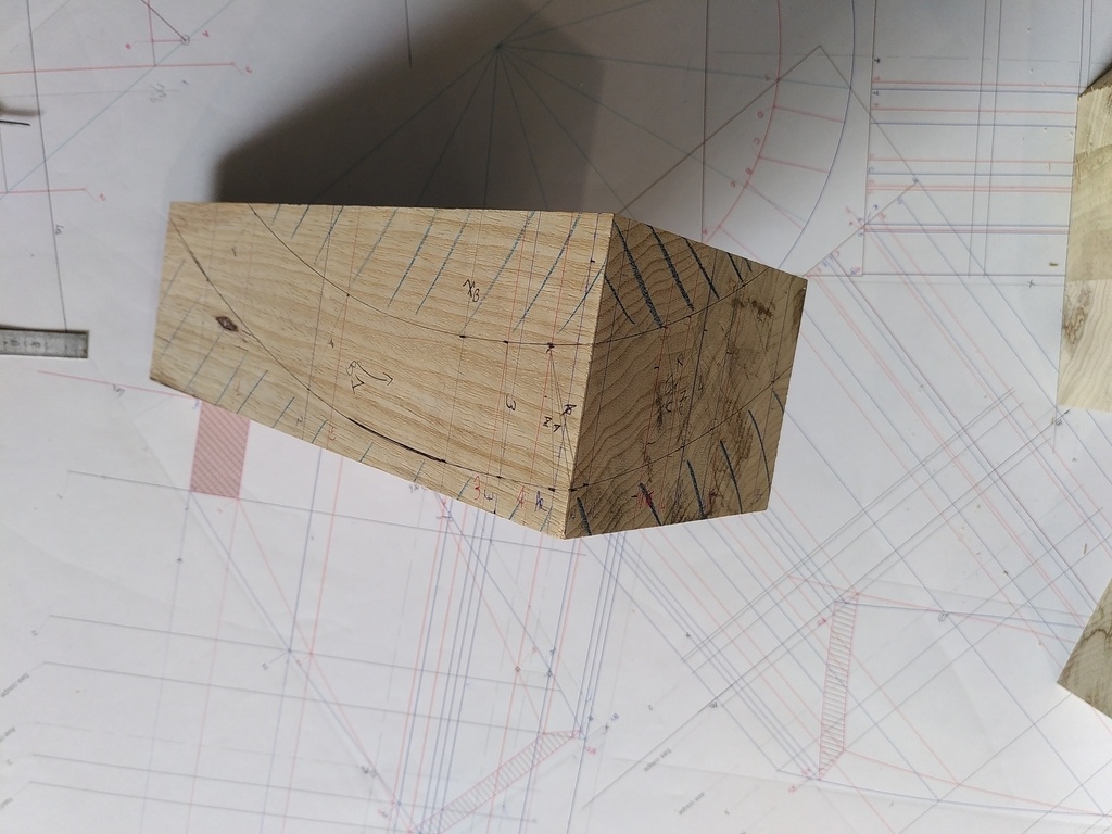 Il s'agit de la pièce de limon courbe de Coubertin, avec sa coupe droite et coupe à crochet réalisées en formation en 2023. J'y ai ajouté un plateau pour la rendre utile. L'ensemble est fait en framiré et le plateau en frêne.