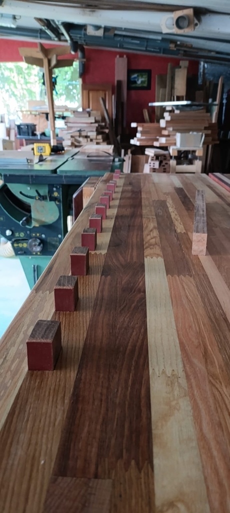 Voici une trentaine d'années j'avais un nombre indescriptible de chutes de bois et ne sachant qu'en faire j'ai pris la mauvaise décision de tout bruler. Gros regrets ensuite, on ne m'y reprendra plus me suis je dit. J'ai ensuite investi pour me procurer un outil d'aboutage pour la toupie, et cela fait une dizaine d'années que je colle, aboute et recolle et aboute toutes sortes d'essences de feuillus en prenant soin de respecter une certaine hygrométrie. Je n'ai pas compter les heures pour la réalisation mais je suis assez satisfait du résultat. La presse latérale ( inspiré de Greenwood youtube.com/wa...taw&t=3029s) m'a pris pas mal de temps. Y a plus qu'à l'utiliser et continuer à réaliser des objets et meubles en m'inspirant de ce site qui est une chouette mine d'informations. Les essences utilisées : Noyer frêne hêtre charme orme chêne cerisier merisier quetschier ou prunier mirabellier poirier. Et pour apporter un peu de contraste du hêtre et charme échauffé du padouk et de l'azobé.