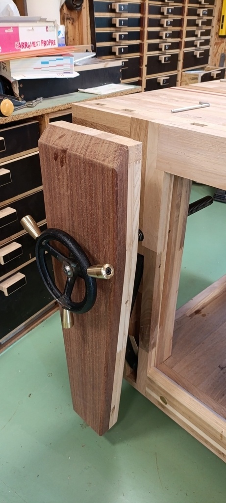 La croix Solo BENCHCRAFTED ainsi que la vis écrou sont ce qui m'a coûté le plus cher. Le volant a été récupéré et les masselottes en laiton ont été réalisées par un tourneur sur métaux ainsi que la modification sur la vis à filetage trapézoïdal.