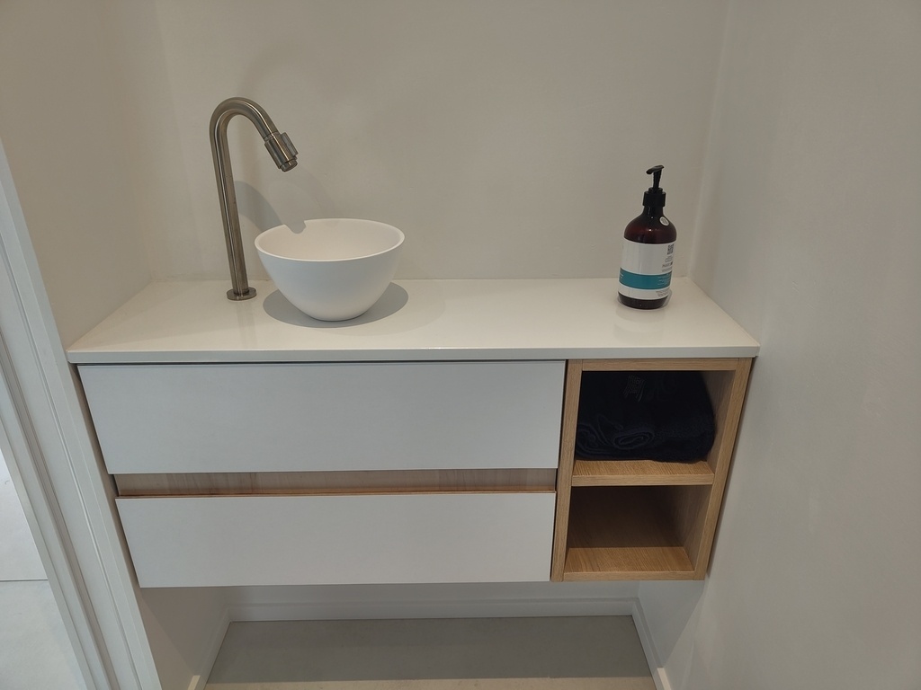 Le plan de travail en pierre et la vasque au dessus seront posées par le client