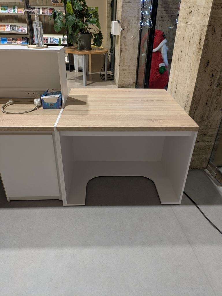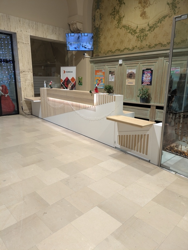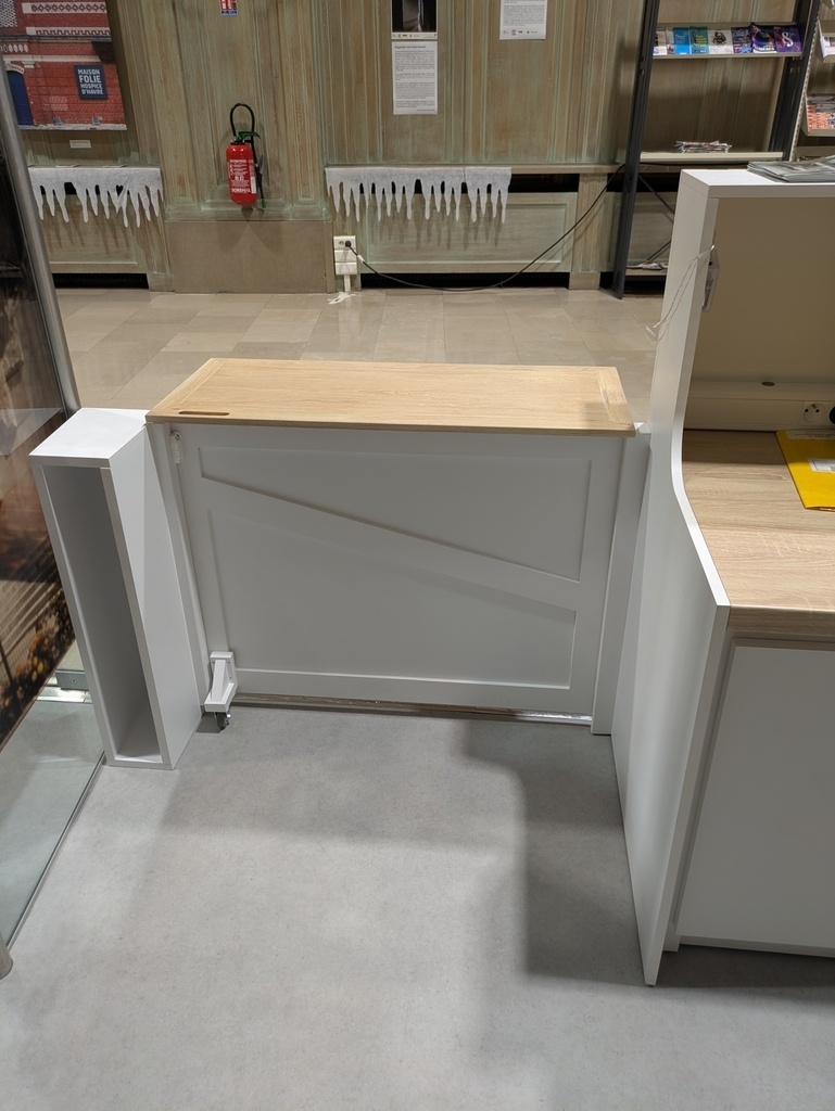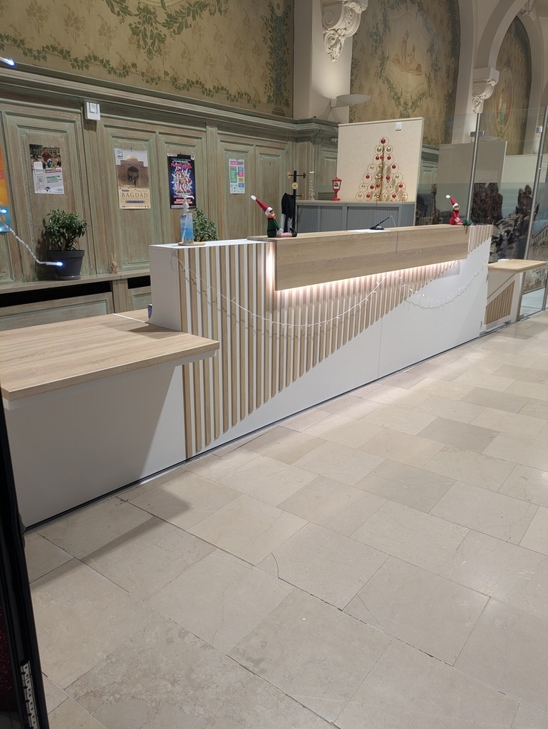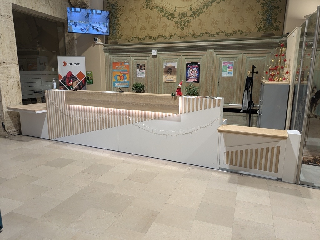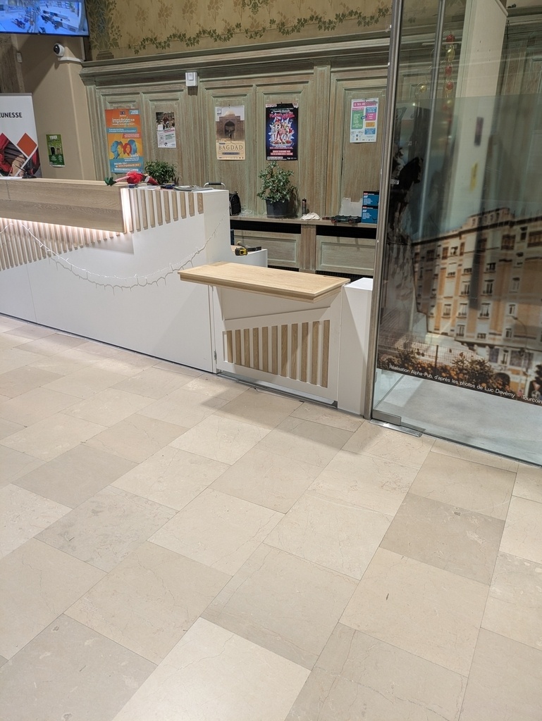 J’ai participé modestement en stage à la réalisation de 2 banques d’accueil du même style, j’ai vissé 250 lattes environ