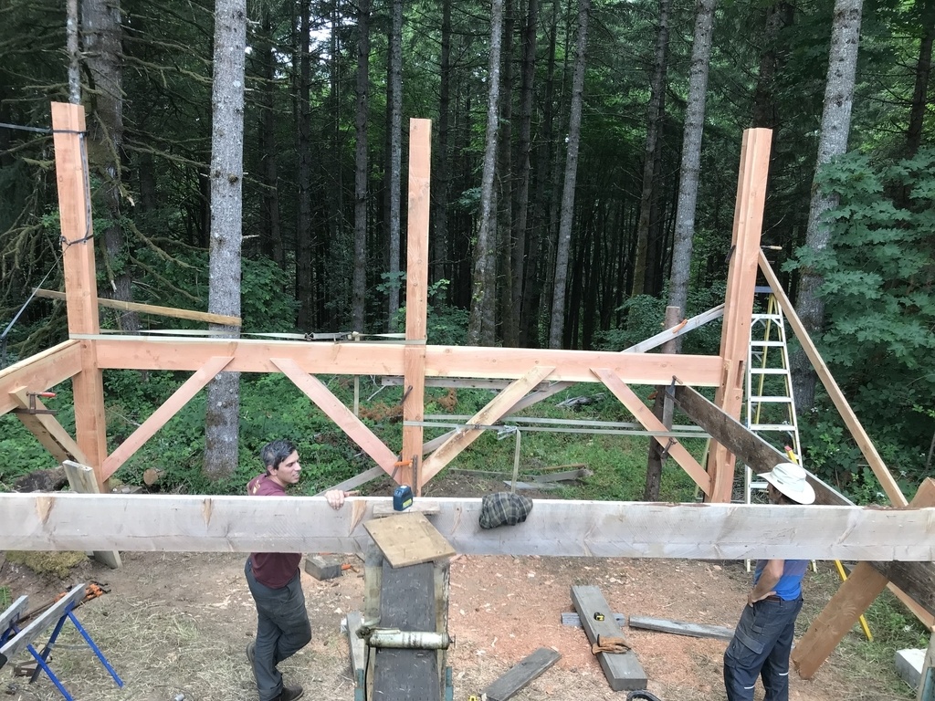 La famille de cet ami a une scierie , le bois vient de leur forêt et il est debité sur place.Les sections étaient importantes ( poteau de 200 x200 , poutre de 300 x100 )et le bois est vert donc lourd a bouger.