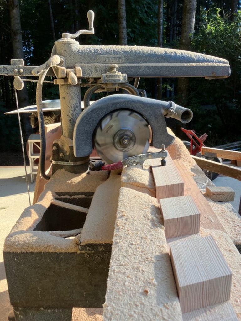 Toutes les pieces de bois ont été sciés sur le "mobile dimension saw" cette scie coupe dans les 2 sens , specialisé pour faire des pieces de construction.