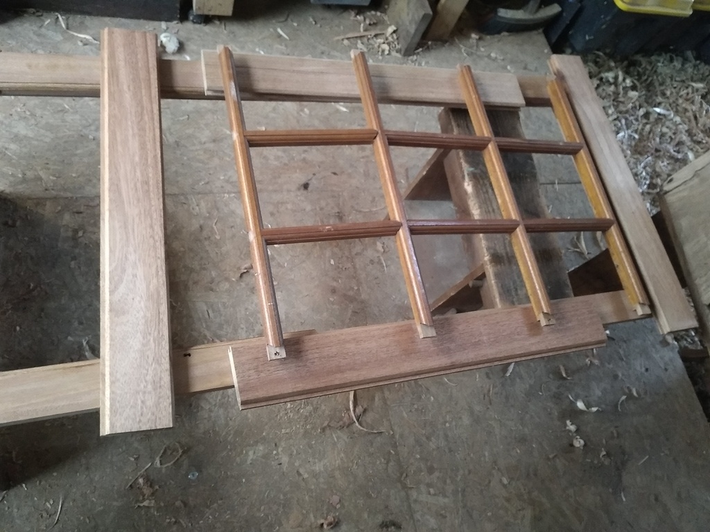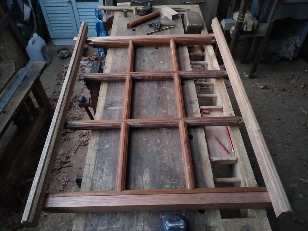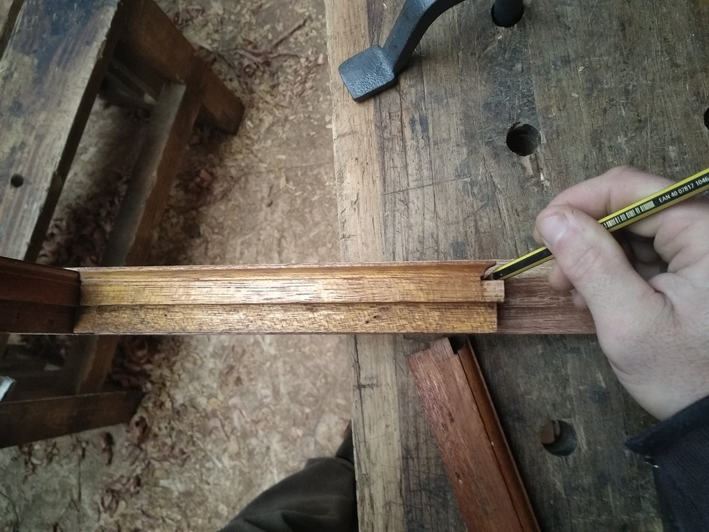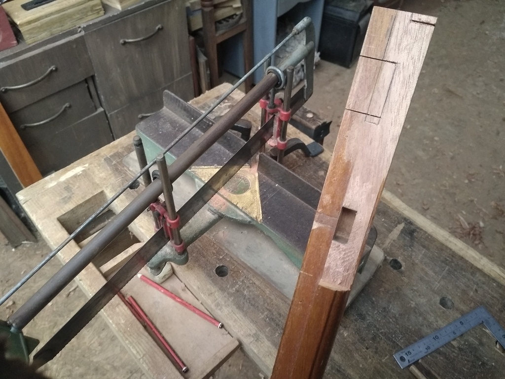 Pour le redimensionnement il m'a fallu scier les montants et les réassembler au moyen d'une enture horizontale à clé (comme un trait de Jupiter).