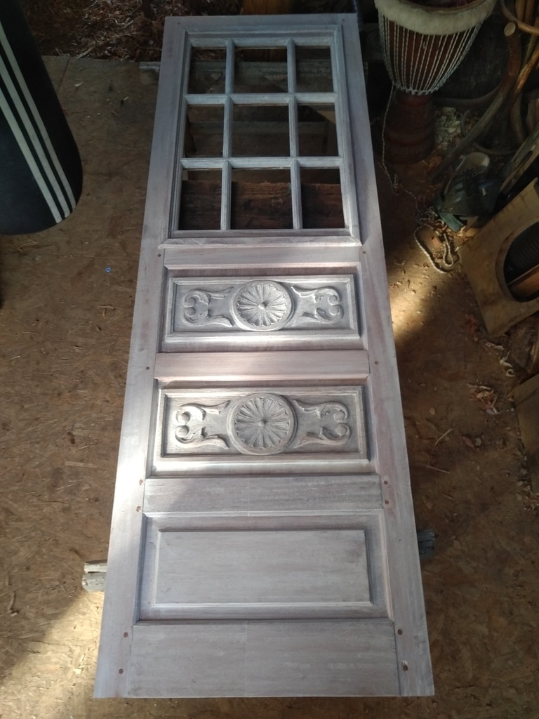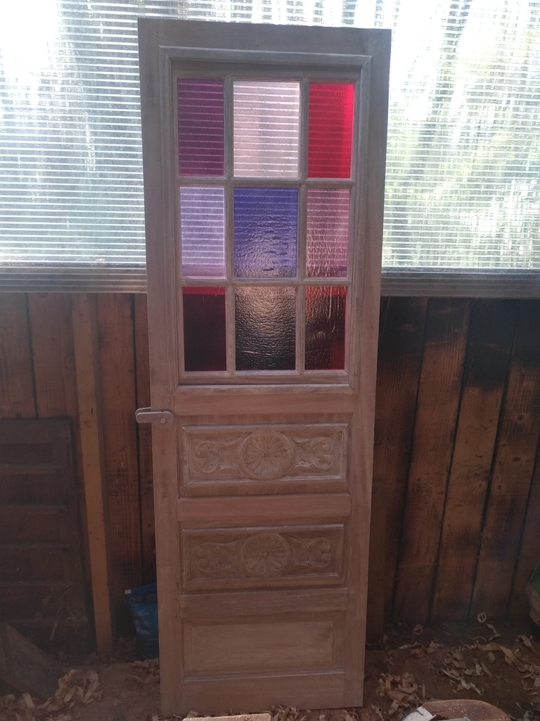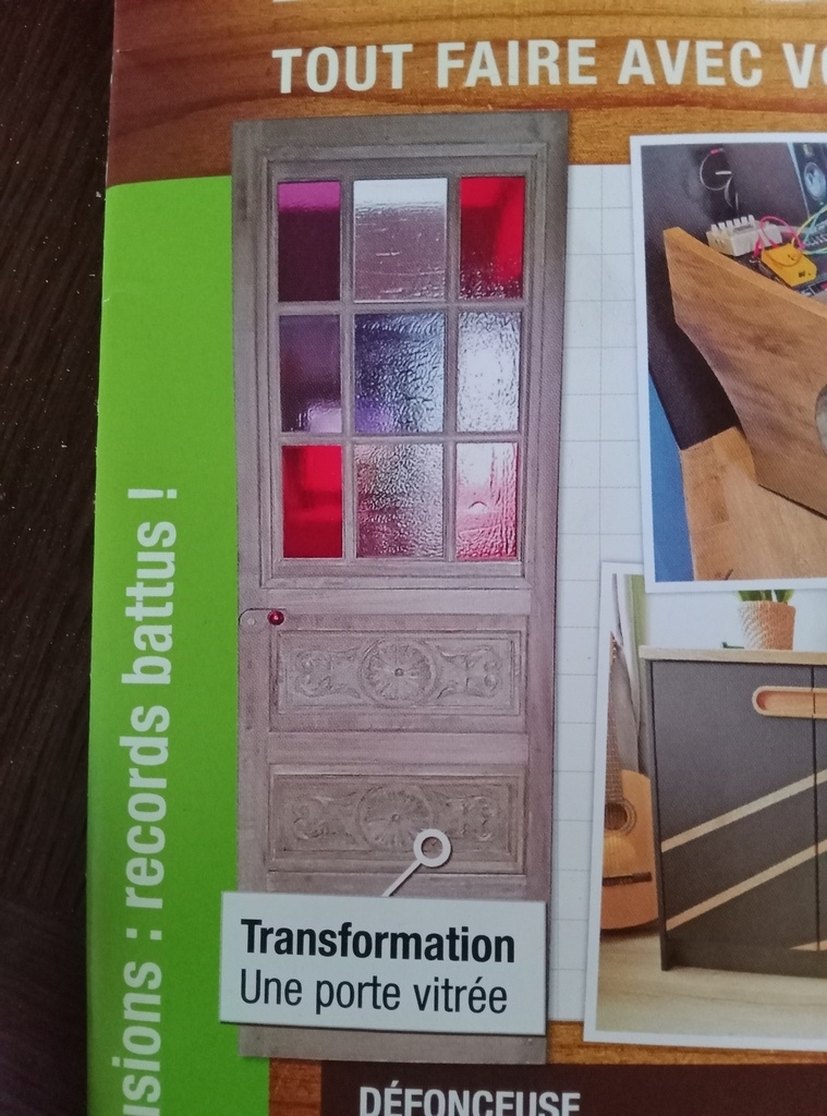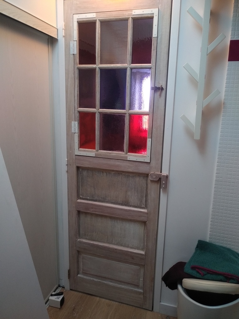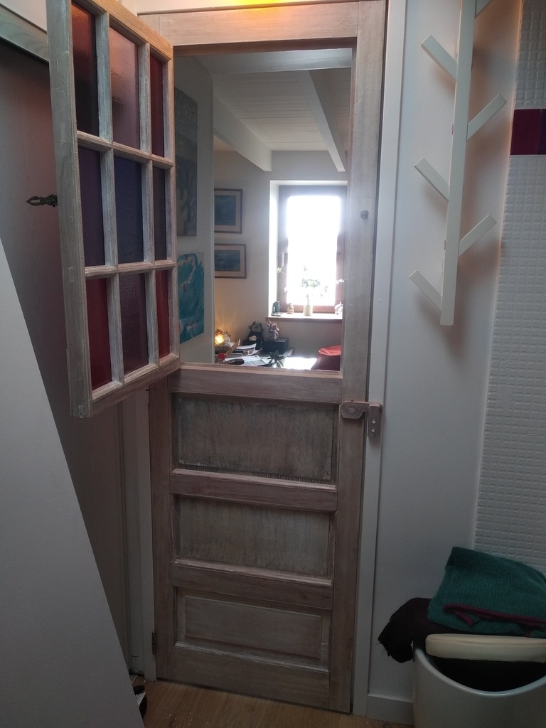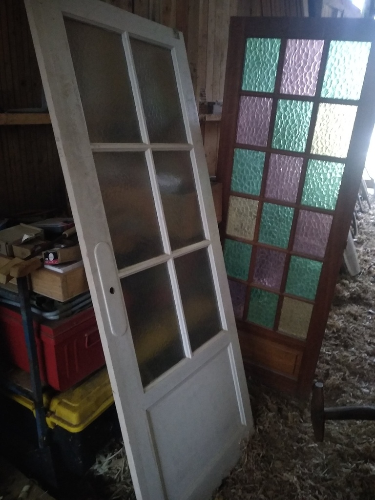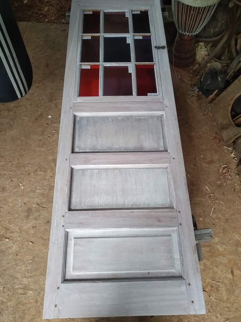 Donc elle voudrait une porte avec un ouvrant, des vitres colorées et soit du vieux bois soit une ancienne porte transformée.