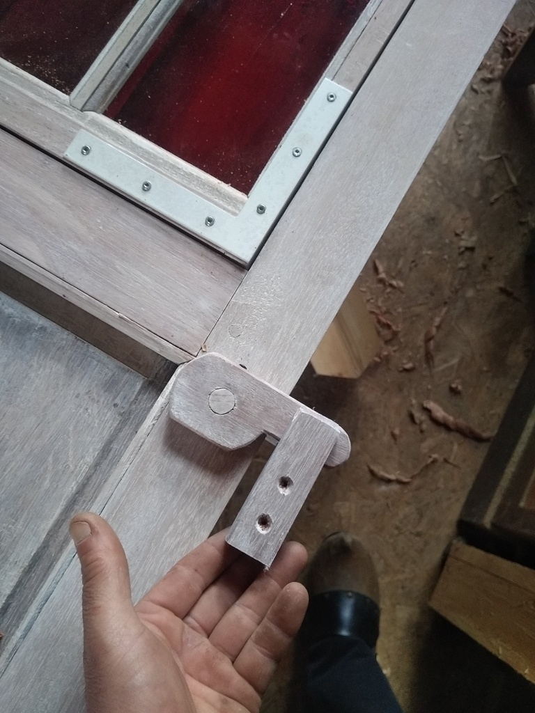 la quincaillerie (de récup!) est peinte en blanc et la poignée est fabriquée dans une chute de lit (la partie qui tient une des lattes).