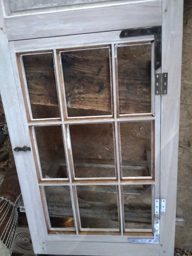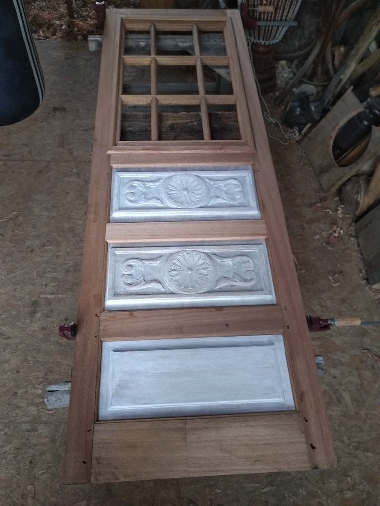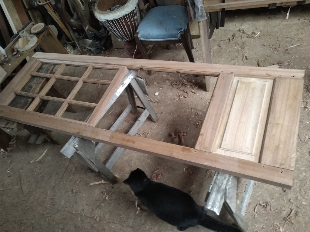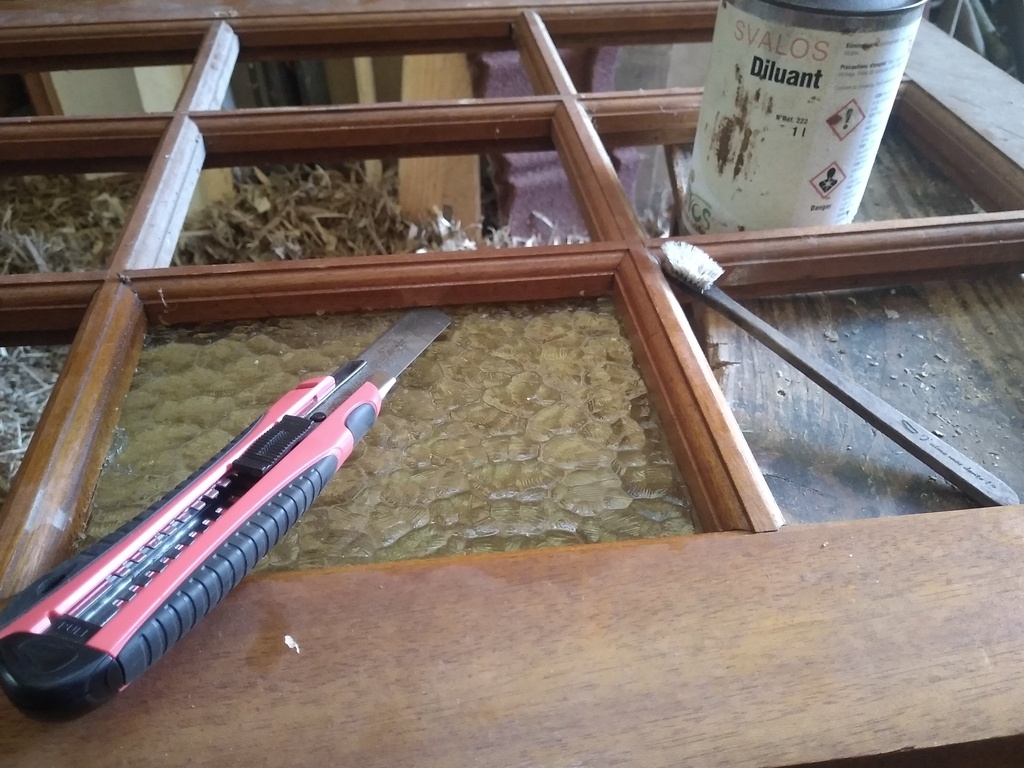 Il a fallu redimensionner la partie vitrée qui prenait presque toute la porte pour ne faire que la moitié (à peu près), en faire un ouvrant et y insérer les nouveaux vitrages (à recouper également).