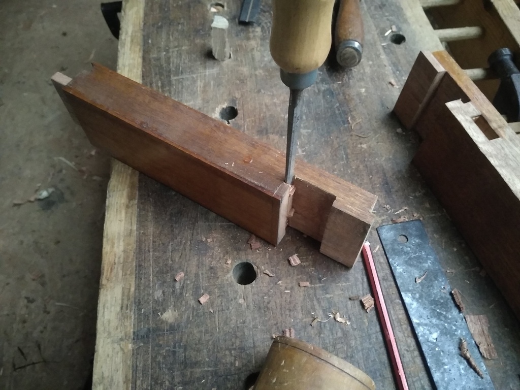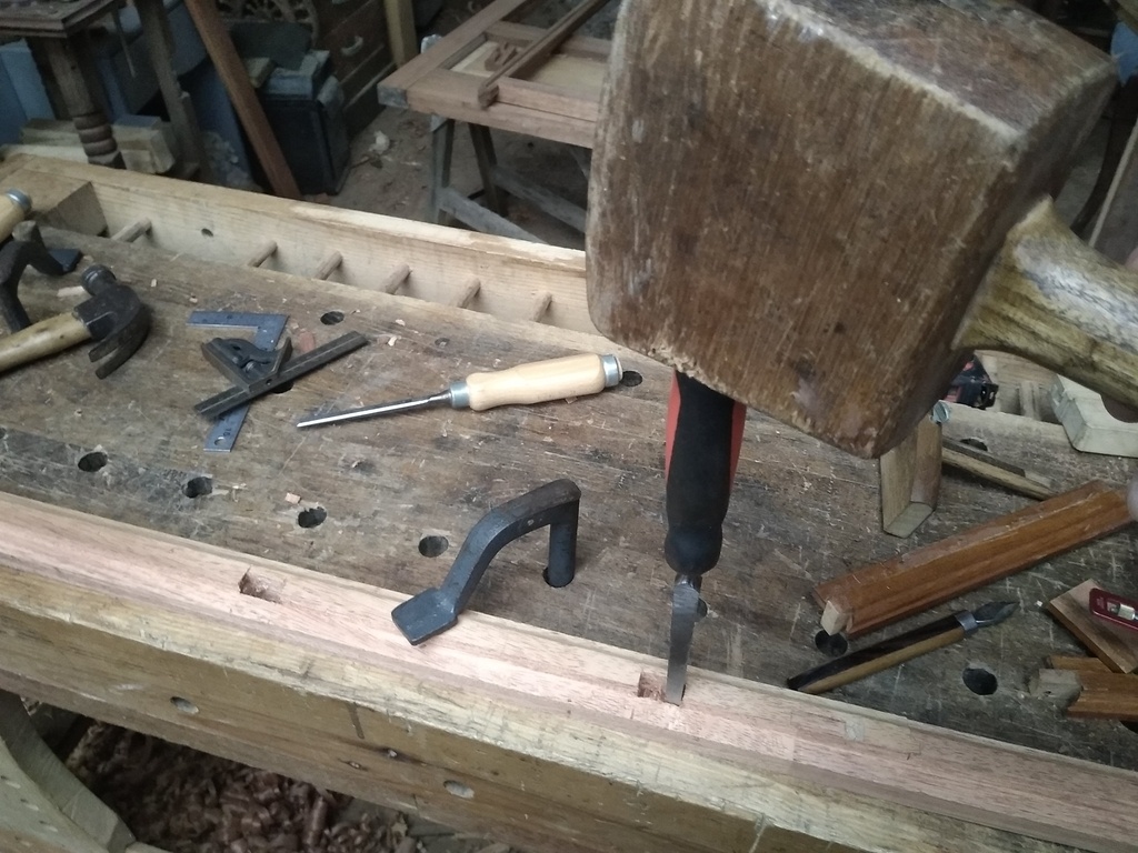 Les tenons tiennent dans le cadre avec des chevilles métalliques (des clous quoi !) qui restent apparentes car depuis que je vois les dégats de certains assemblages cachés j'ai décidé de ne plus cacher.