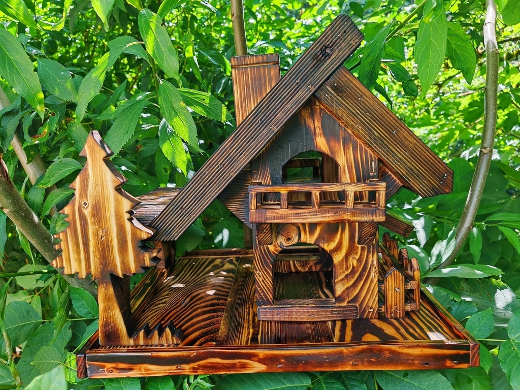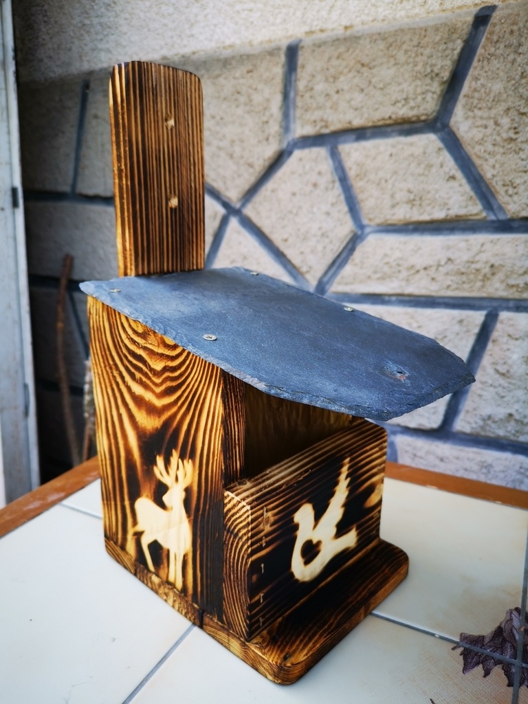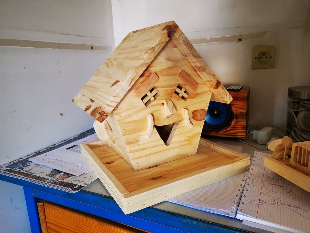 J'ai réalisé plusieurs mangeoires ces dernières années aussi je vois que tu as une bordure sur le pourtour comme j'en faisais moi-même au début, pensant empêcher que les graines tombent au sol..