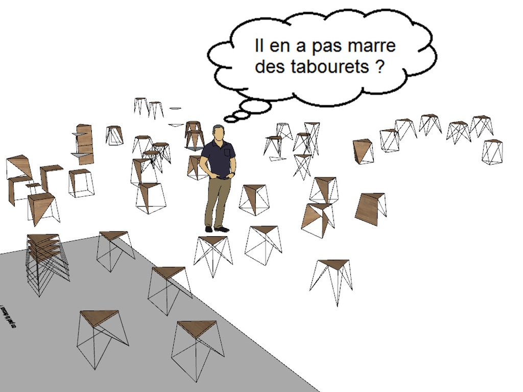 Dans le sillage de mes expérimentations, j'ai continué à chipoter avec SketchUp pour tenter d'avoir un modèle de tabouret solide, stable, empilable, ...
