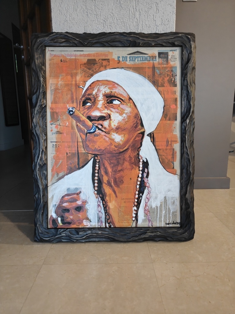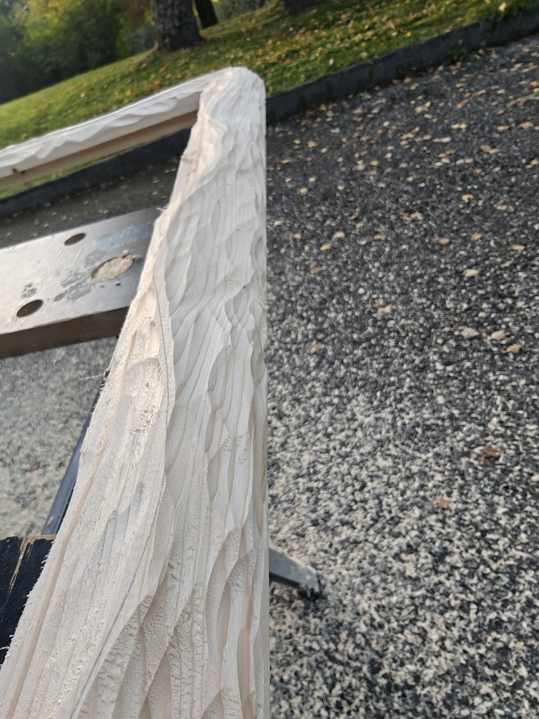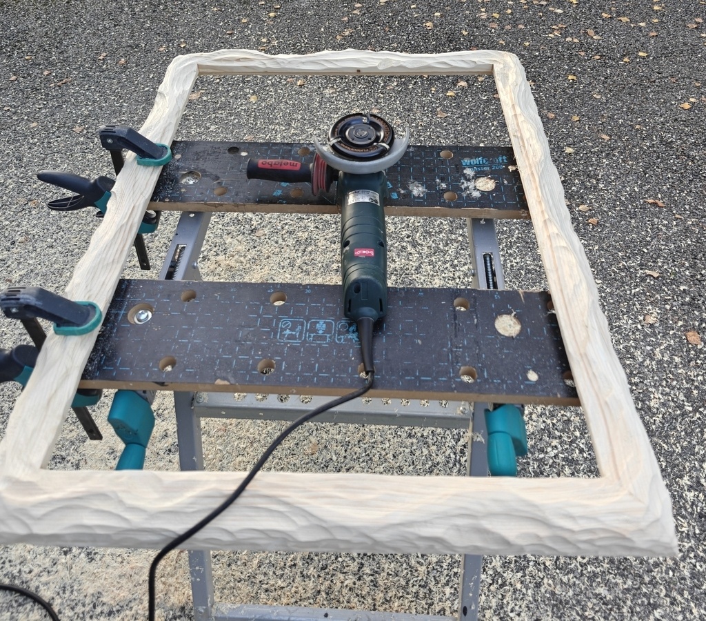 Le cadre est en pin et l'effet organique a été fait à la disqueuse montée d'un disque Arbortech