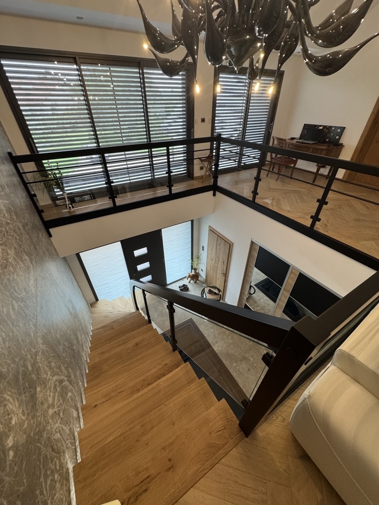 Fabrication d’un escalier sur limon central bois laqué noir mat marche en chêne rustique, garde corps courbé et remplissage verre