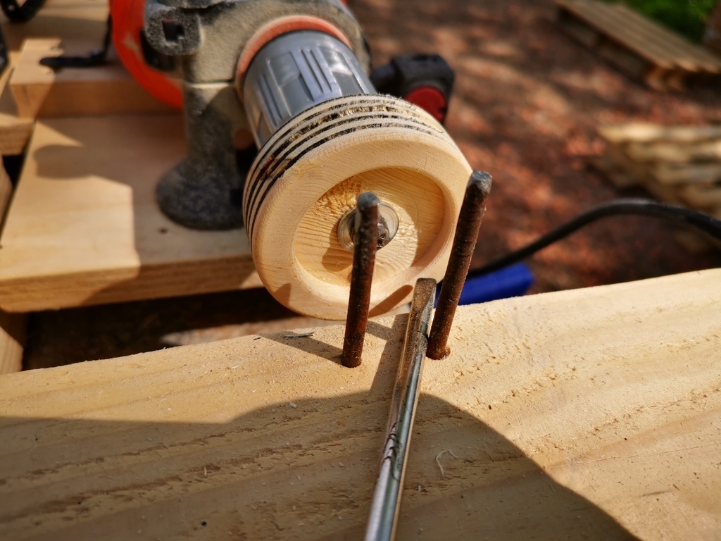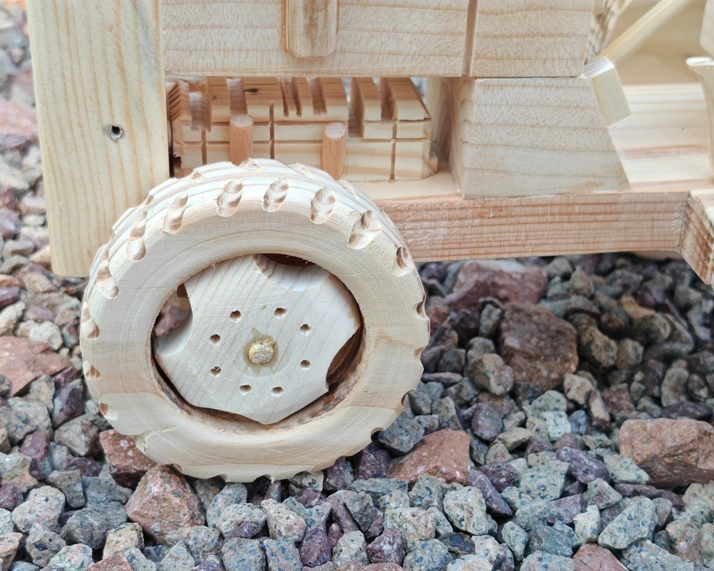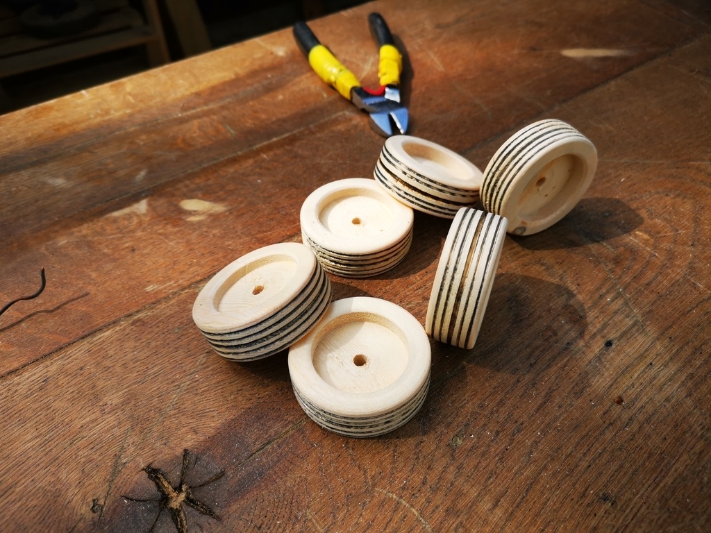 merci Roger , pour les roues je les fait sans tour a bois , je me sert d'une perceuse en guise de tour fixé sur un socle ou je fini le ponçage pour bien arrondir les cotées et le centre , mes roues sont d'abord découpés avec une scie cloches au diamètre voulu et ensuite je les fixe avec un axe fileter sur la perceuse pour finir l'arrondi je sais pas si j'ai bien expliquer , j'ai rajouter quelques photos de mon système , pour faire les crampons de tracteur je me sert d'une dremel avec une meche style râpe