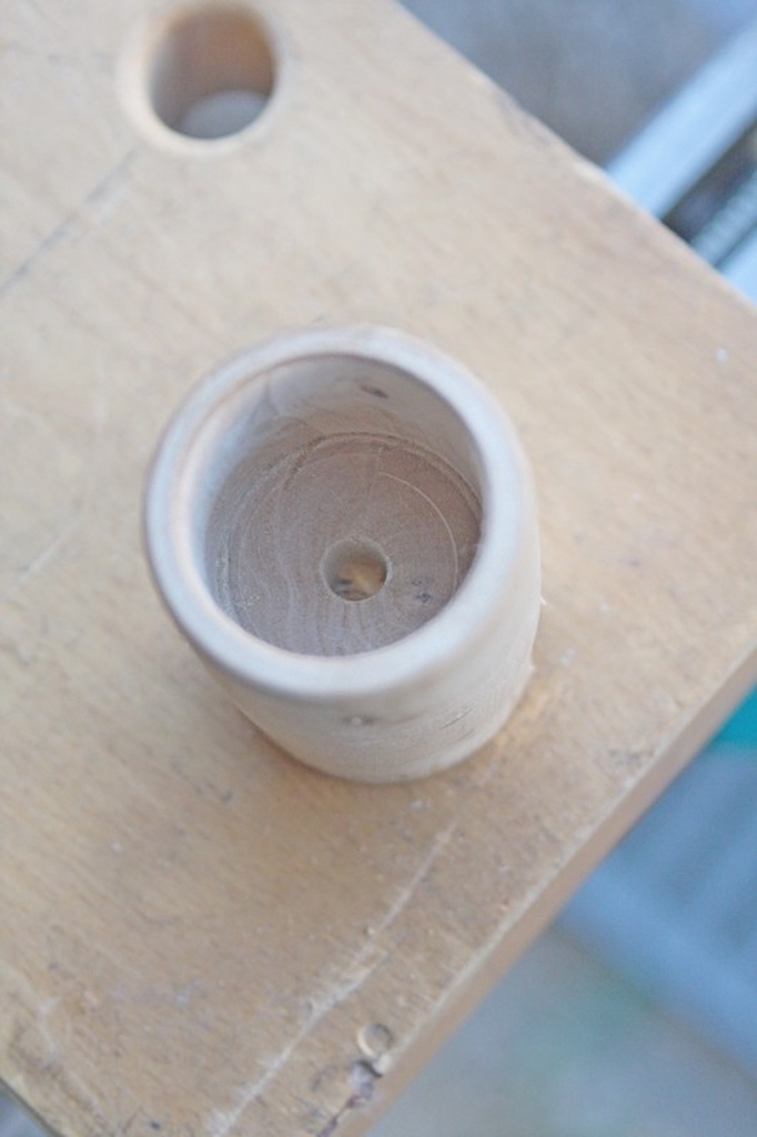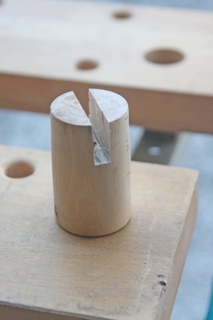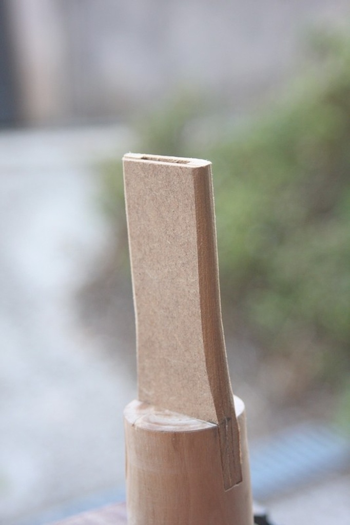 Tournage d'un bout d'arbre inconnu (entre le platane et le buis, on est large) puis réalisation d'un fin pavé débouchant (ce ne peut être dénommé tube) à partir de 3 bandes de MDF de 3mm (c'est assez arrangeant l'interstice mesuré entre lamelles étant de 9) et enfin rainurage de la pièce tournée pour y insérer le pavé. Petit gabarit ultra vite fait pour passer une pièce ronde sur la scie sous table, et voilà.