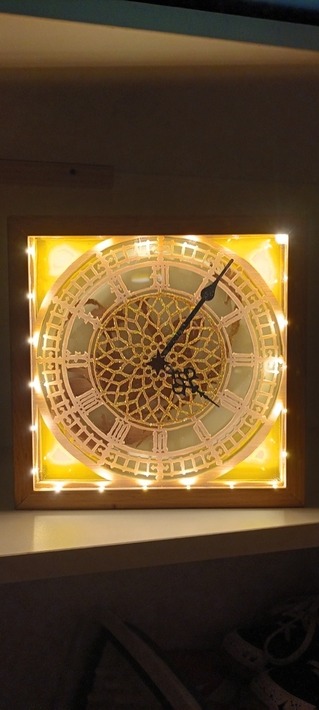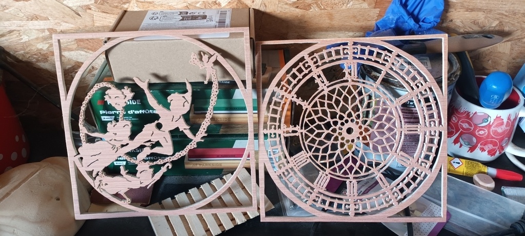 Réalisation d'une nouvelle Light Box détournée en pendule, sur le thème de Big Ben et Peter Pan, 2 tableaux en CP de 5mm épaisseur, cadre en parquet bois massif, plaque de plexiglas pour protéger l'intérieur de la poussière et d'éventuels chocs, système de pendule avec un pas de vis de 21mm, ruban adhésif de leds blanches. Le soucis est que je n'ai pas pu coller le ruban de leds à l'arrière comme d'habitude faute de place, j'ai dû le coller sur l'avant ce qui ne met pas en valeur mon dernier tableau !!!... c'est une première, les suivantes seront mieux sinon beaucoup de travail sur le tableau de Big Ben, plus de 200 trous!!!...