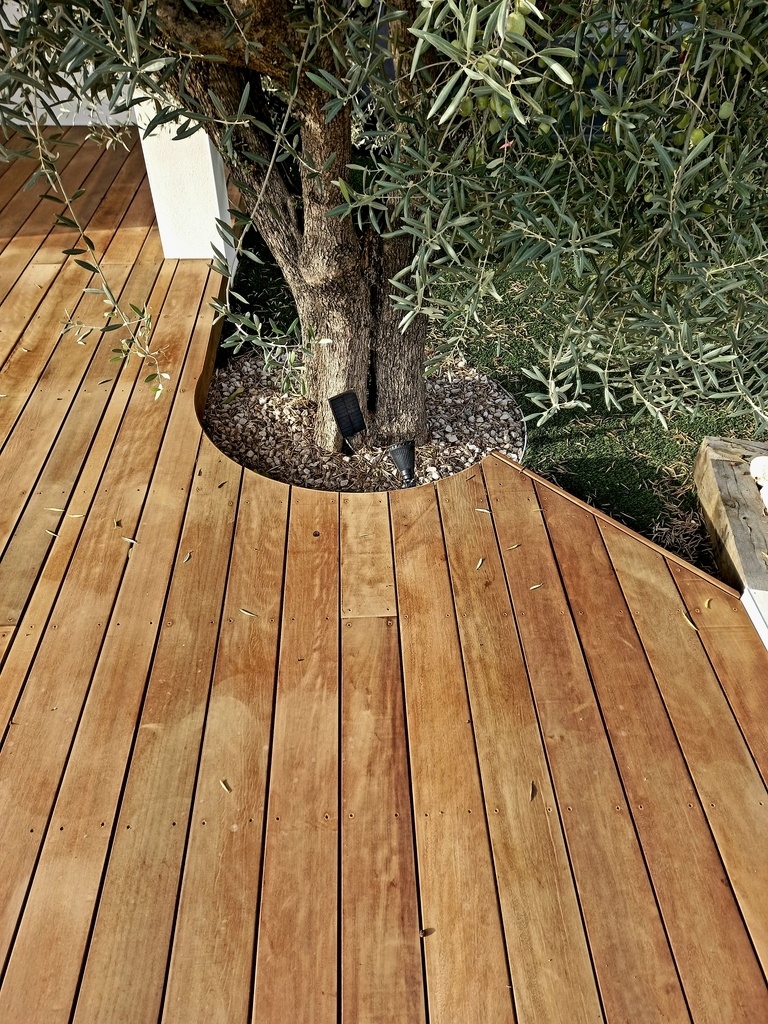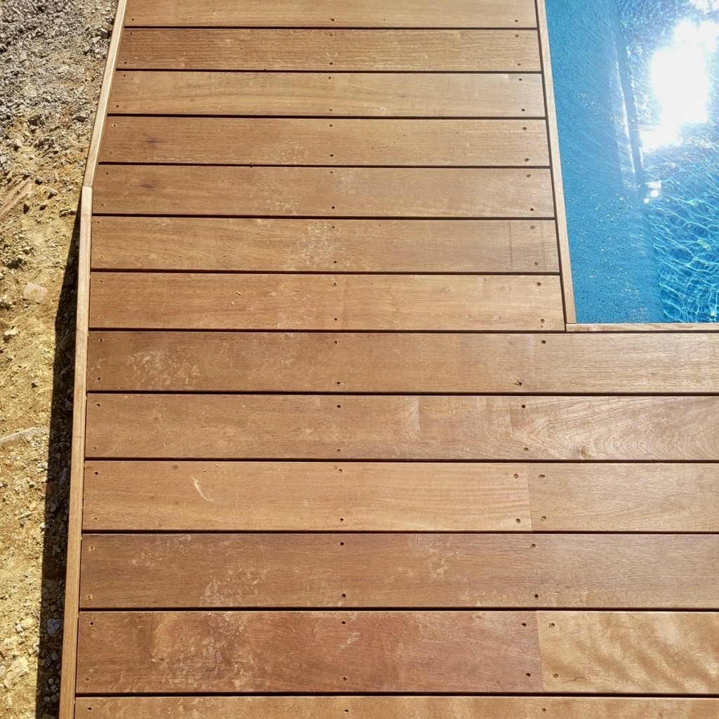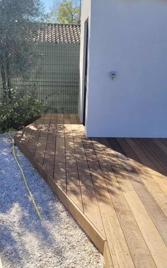 L’itauba ça se travaille pas mal mais ça fait des petites échardes biens nocives, j’ai donc fini par un ponçage complet au 120 après avoir arrosé la terrasse.