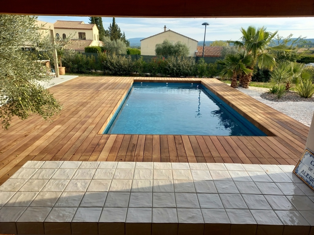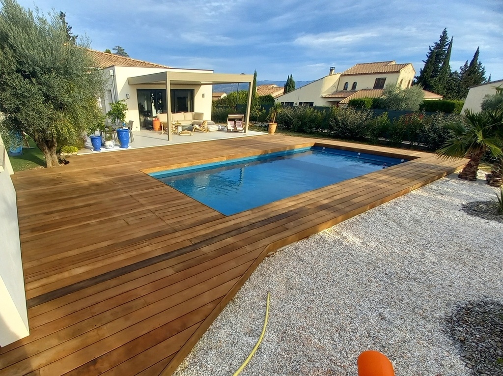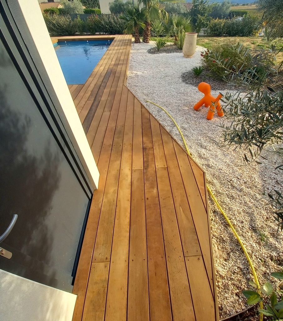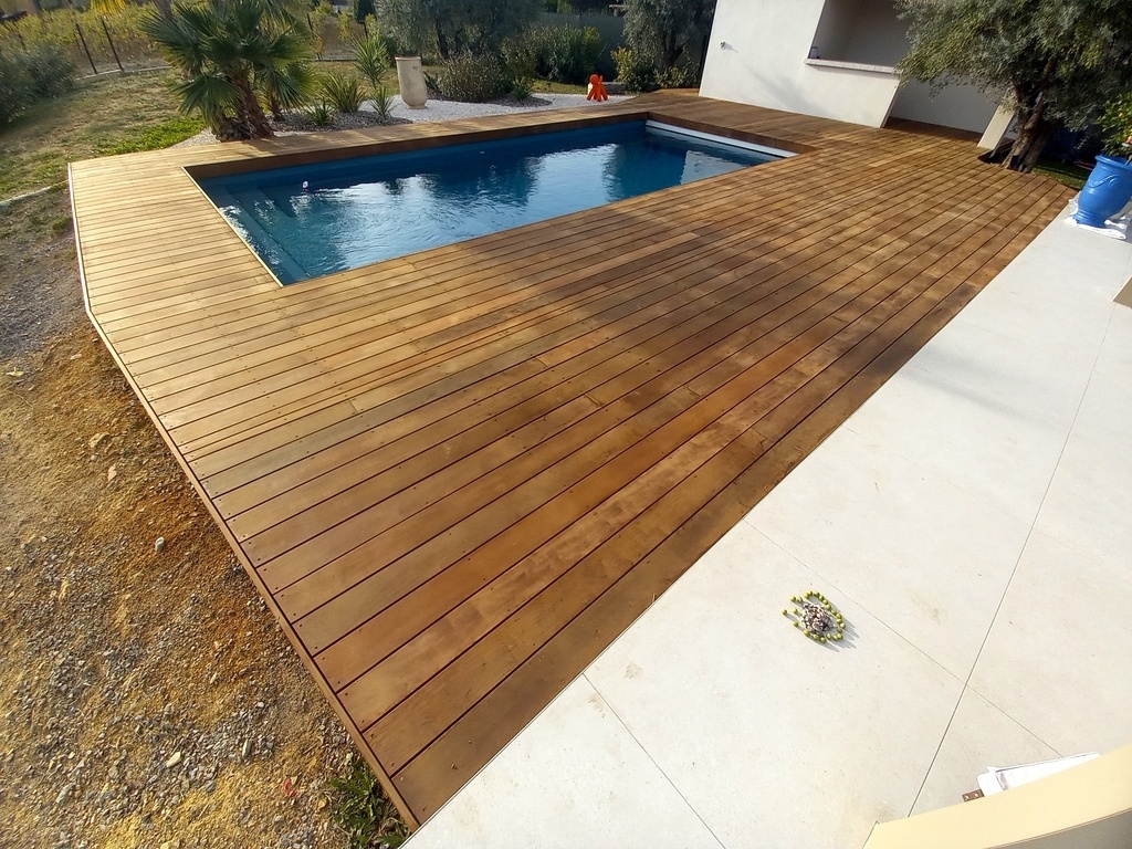 Elle est classe cette terrasse ! Tu aurais du faire une feinte pour un p’tit plouf: désolé msieur dame mais pour visser l’habillage périphérique du pourtour du bassin faut qu’j’m’y plonge …!