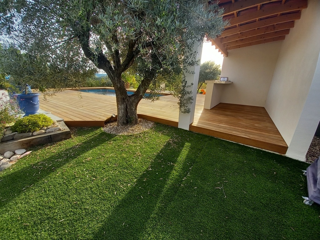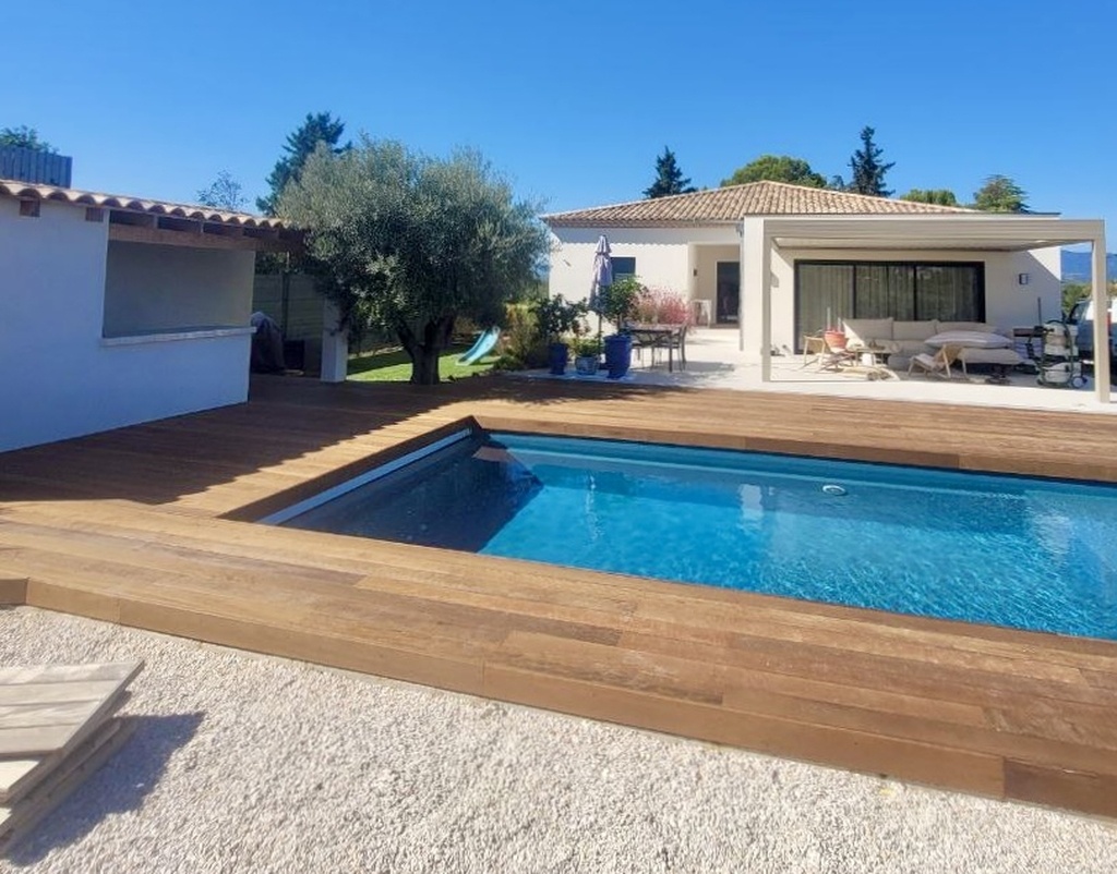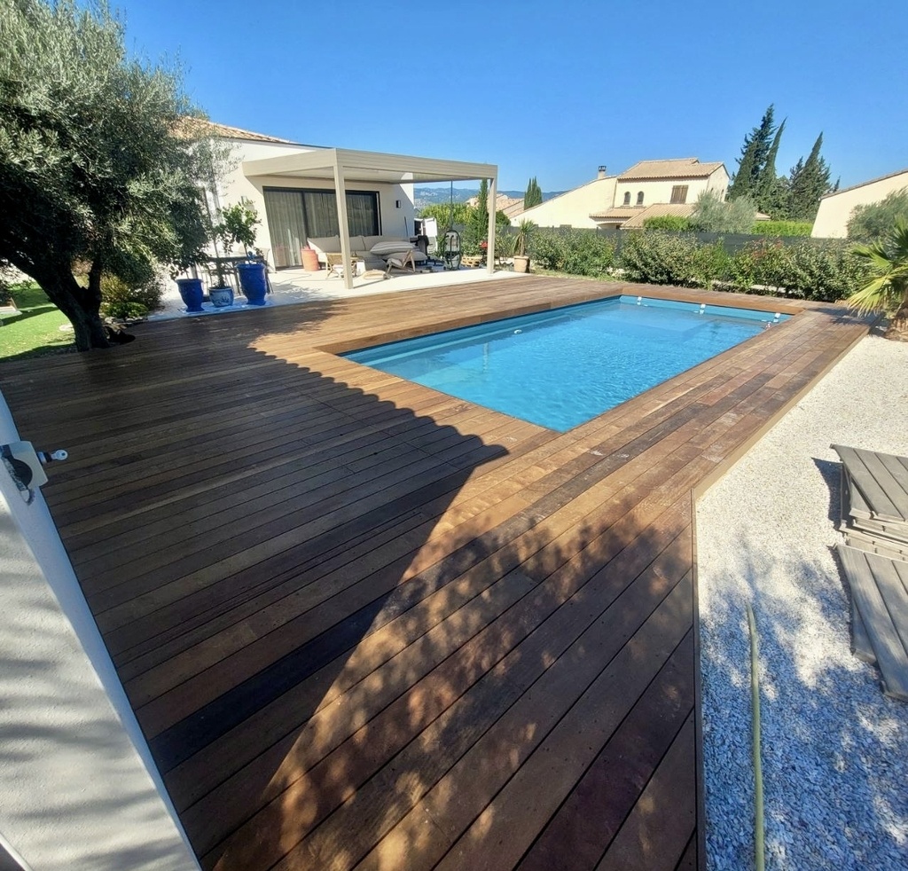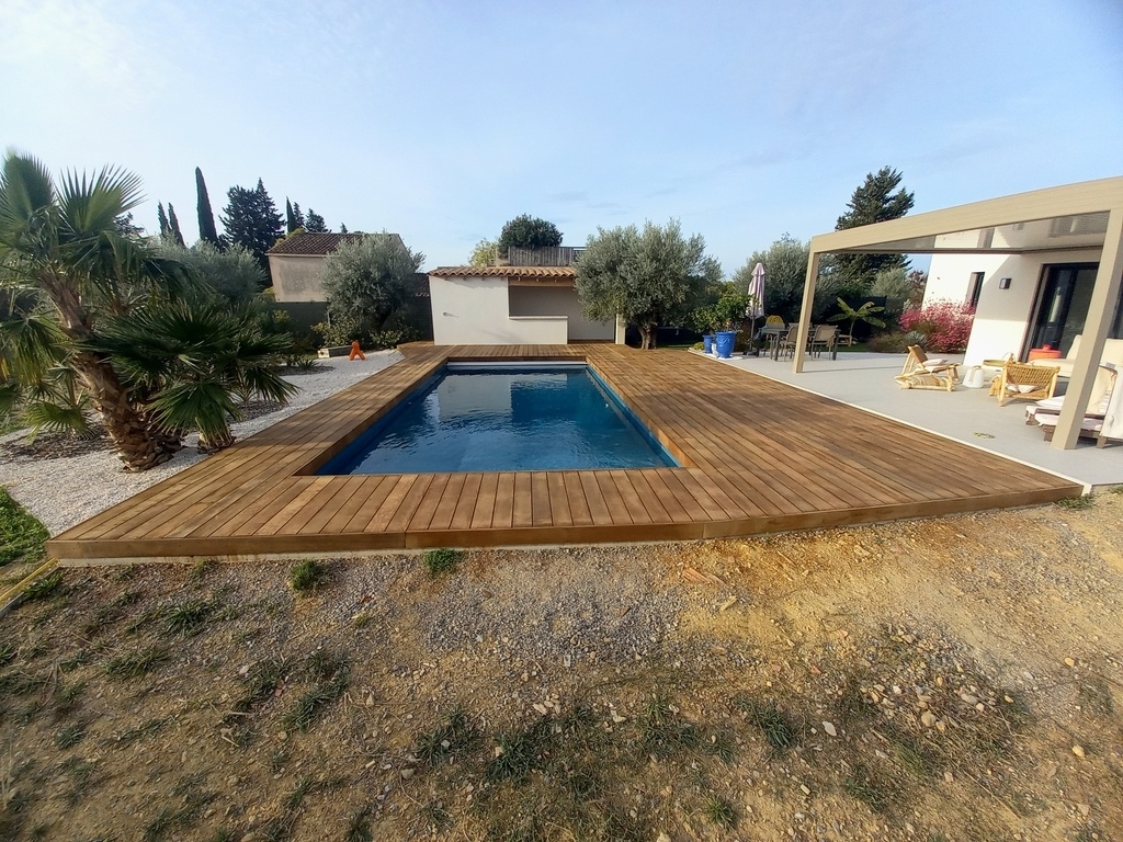 Elle est classe cette terrasse ! Tu aurais du faire une feinte pour un p’tit plouf: désolé msieur dame mais pour visser l’habillage périphérique du pourtour du bassin faut qu’j’m’y plonge …!