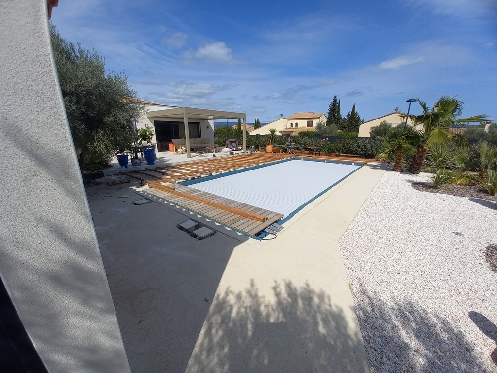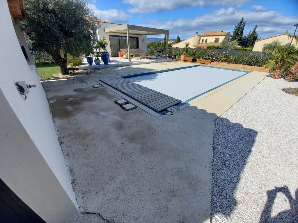 Il y’a un cache en 4 parties pour le volet roulant de la piscine, quatre trappes pour les skimmer et les accès elec.