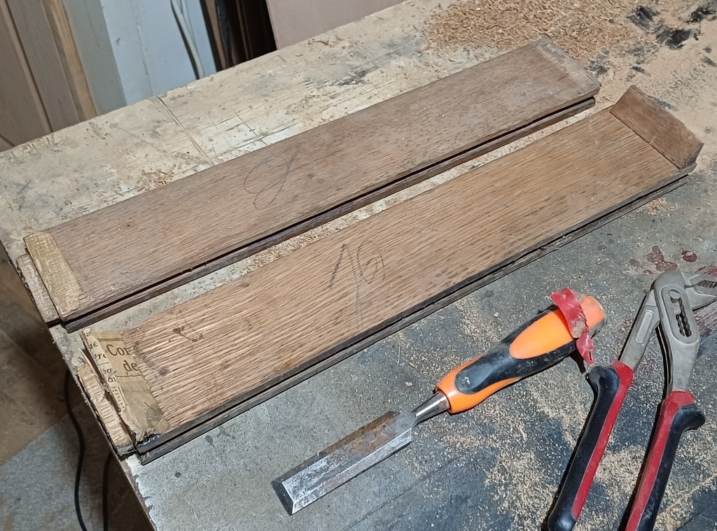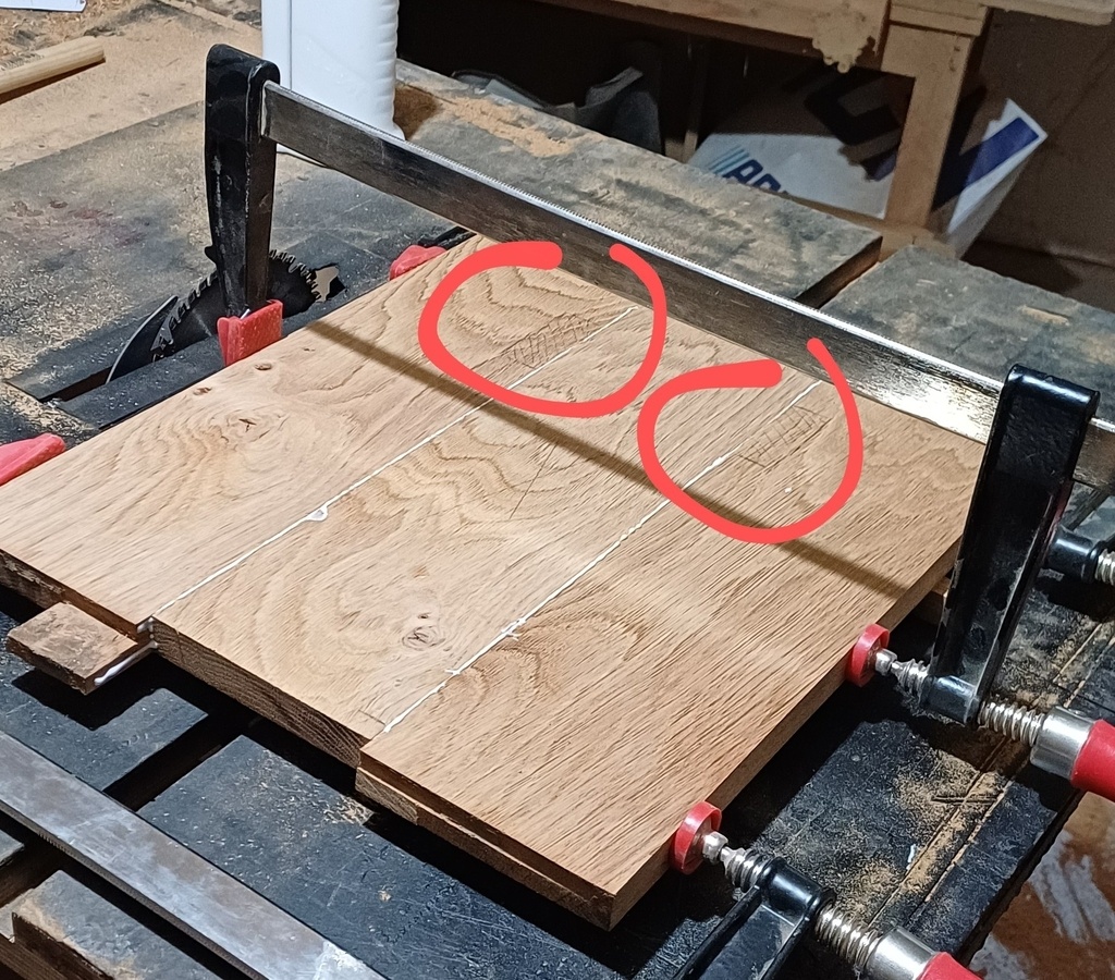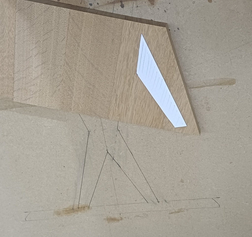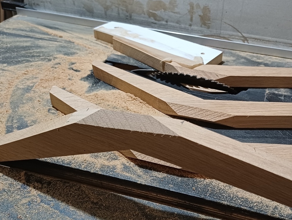 Je les ai coupé avec le sens du fil dans le même sens que la longue partie des pieds, histoire que la jonction collée entre les deux soit bois de fil contre bois de fil et donc solide !