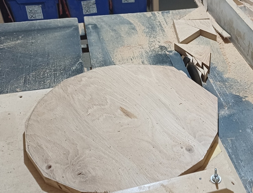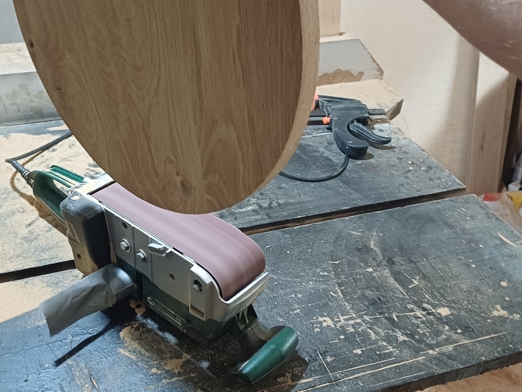 J'ai dégrossi le plateau et je l'ai présenté à la ponceuse à bande en le maintenant vertical pressé entre mes deux mains et en le laissant légèrement tourner tout seul avec la bande. Ça a bien marché.