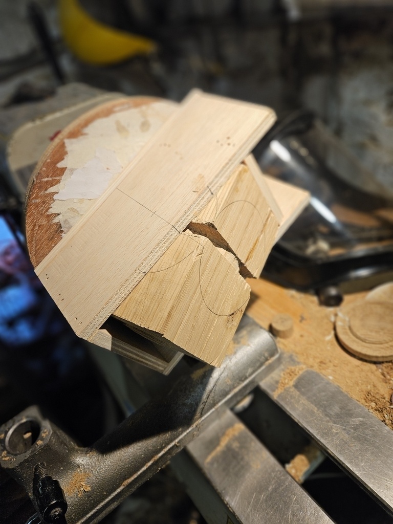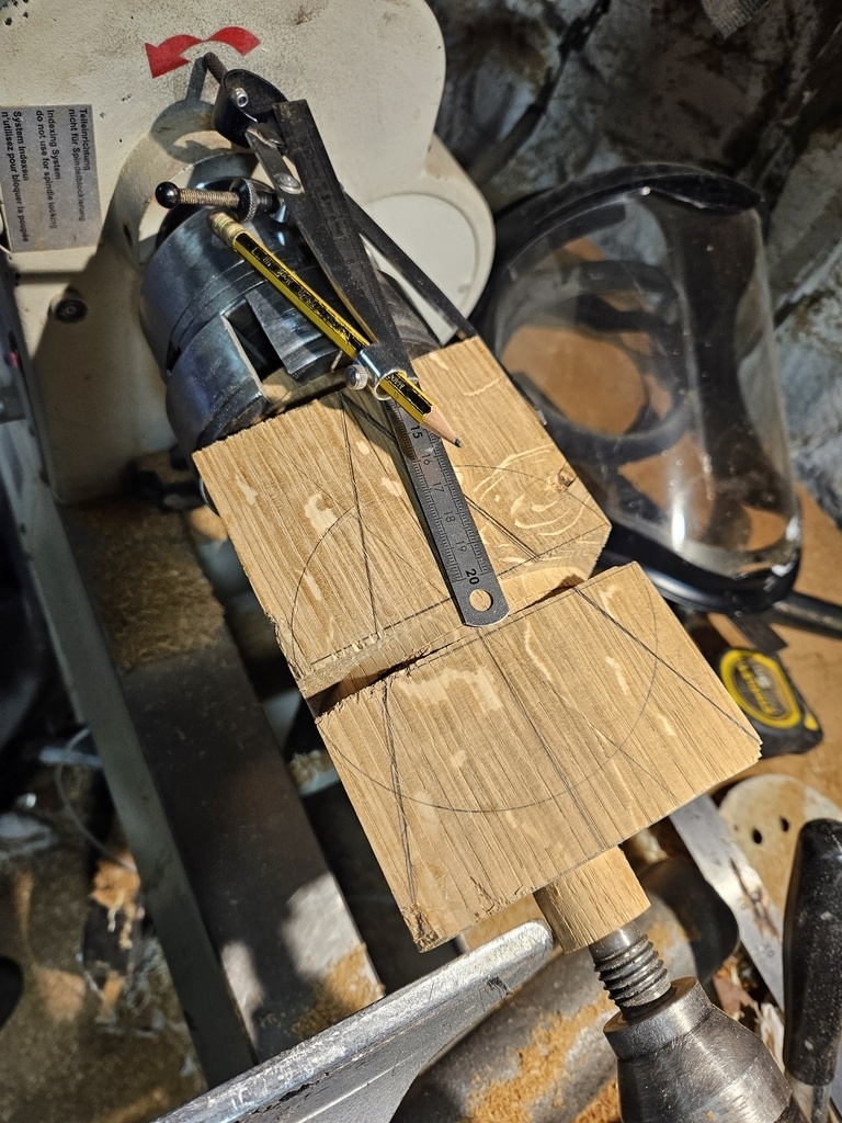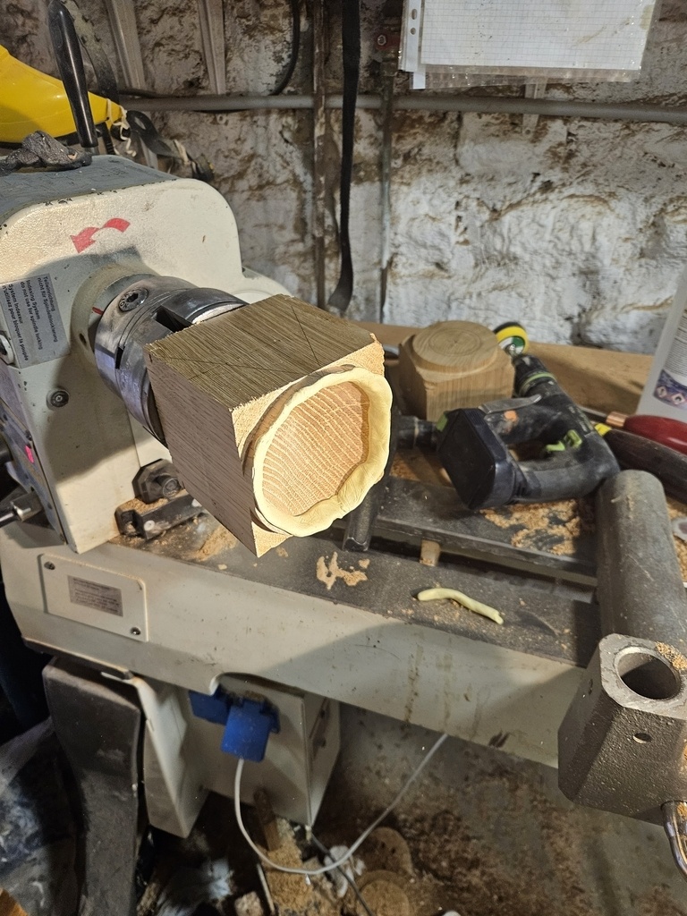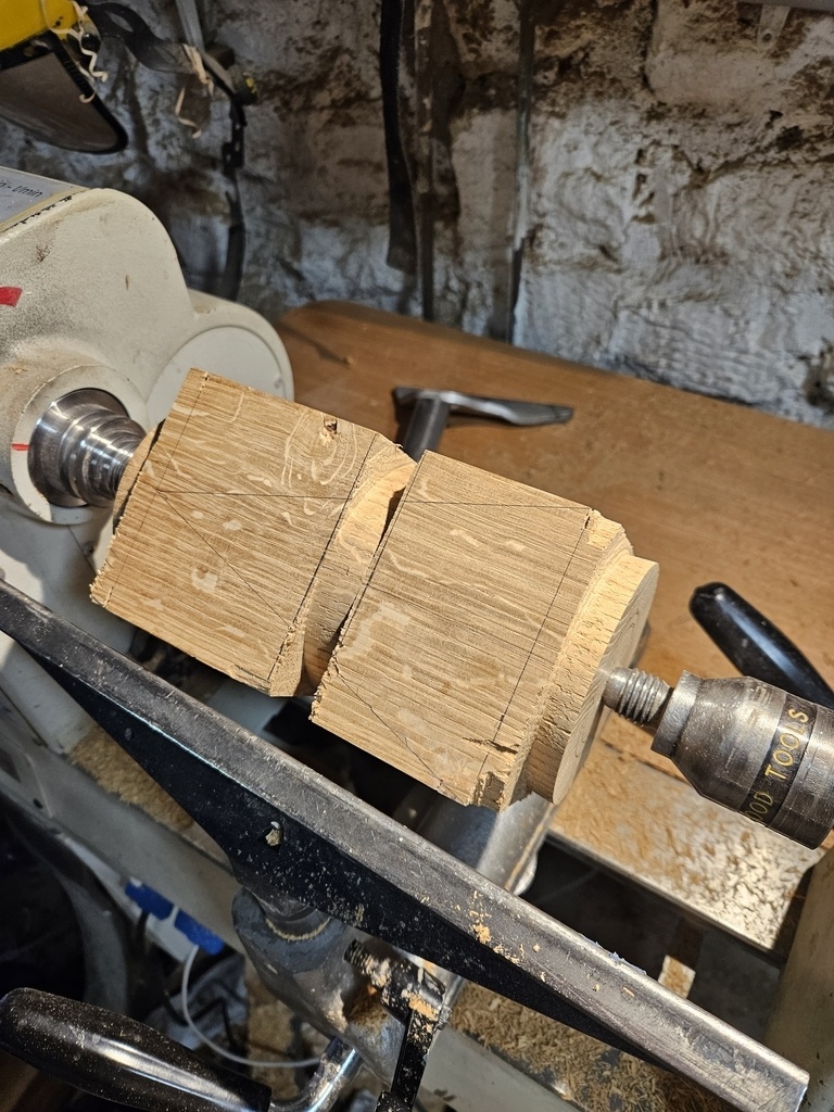 On fait deux tenons, on coupe la pièce au centre de ce que sera la sphère. On creuse chacun des deux côtés, pour l'intérieur des deux demi sphères.