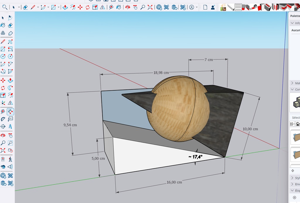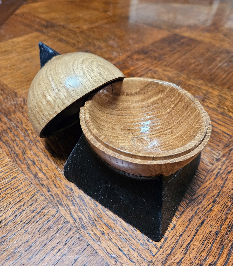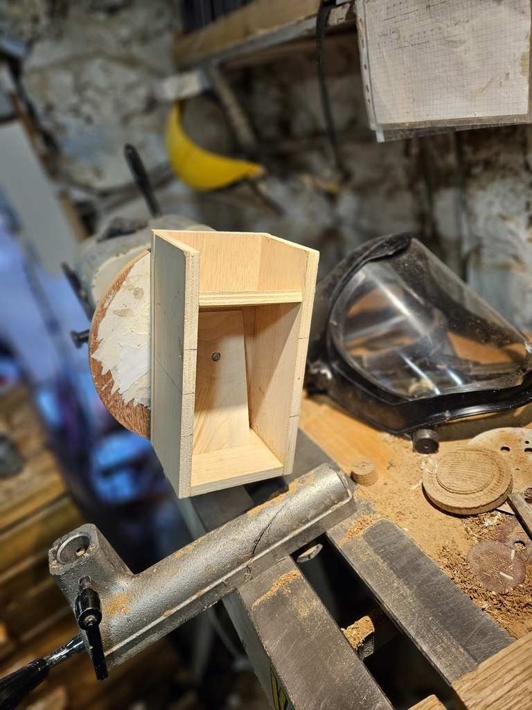 Maintenant je me suis attaqué à beaucoup plus compliqué, une sphère dans une pyramide uniquement au tour à bois (aucun trait de scie). En plus, pour corser, j'ai fait cela sous forme de boite.