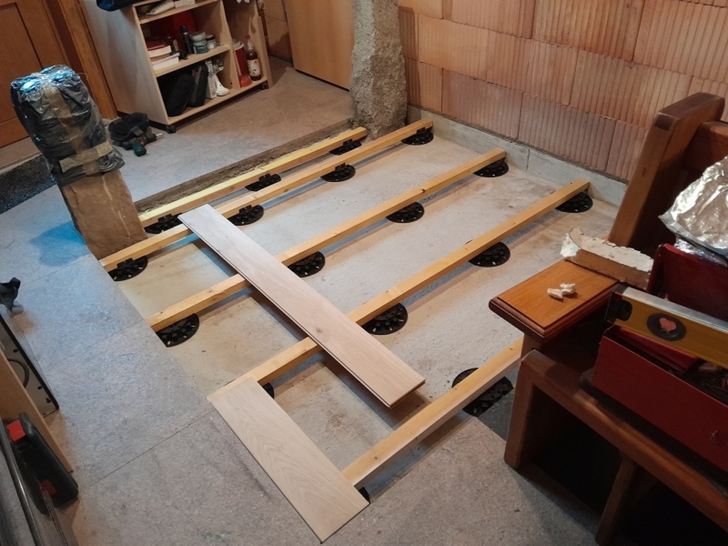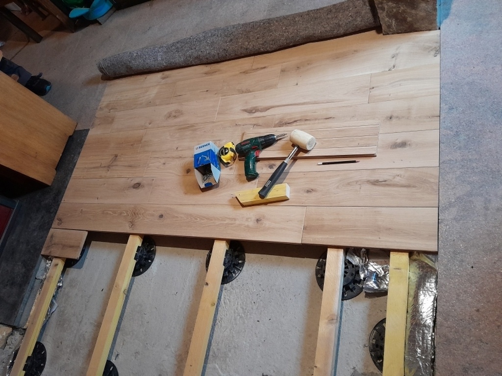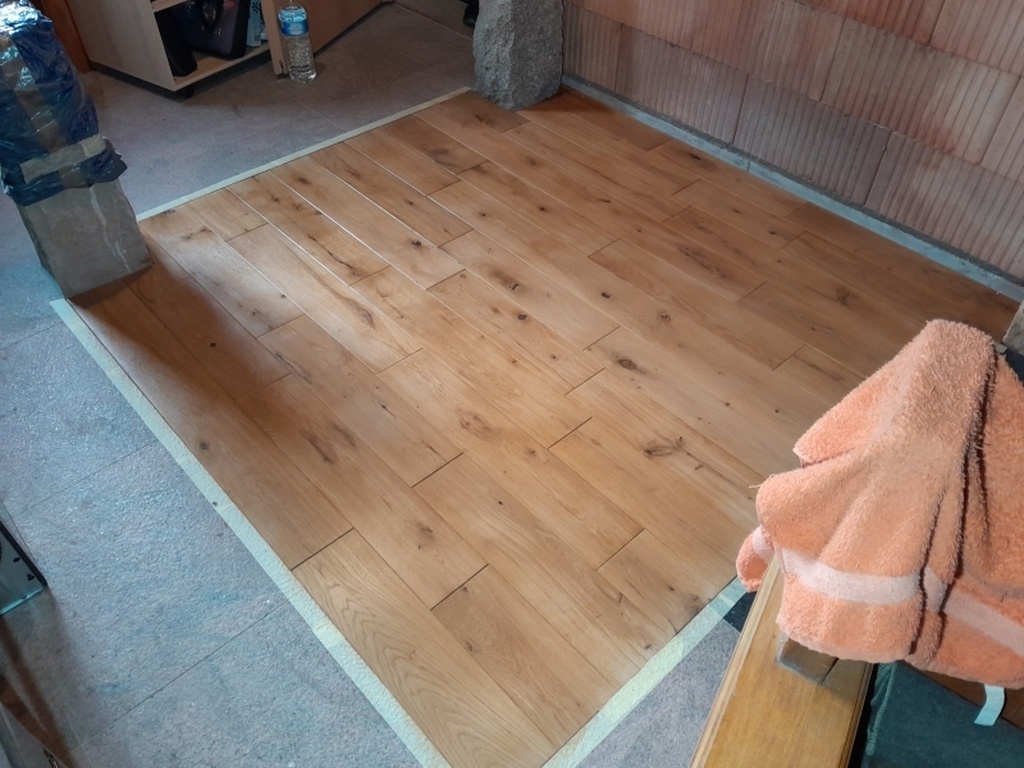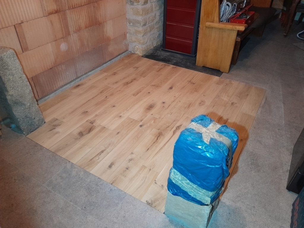 Plancher en chêne fourni par le client, posé sur plots dans une fosse de 2 x 2m. Rien de compliqué mais quand même quelques découpes pas évidentes au niveau des bornes en granit.