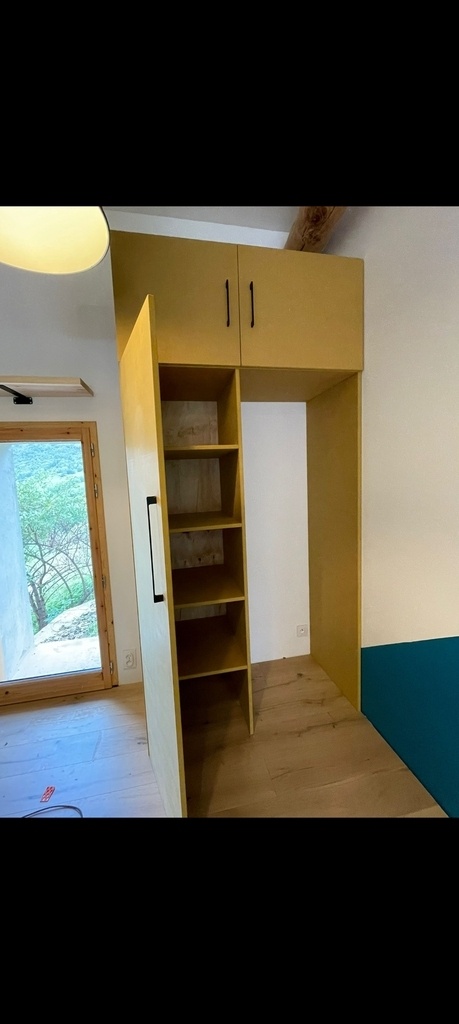 Ce meuble a été créé à partir de valchromate jaune de 19mm (la couleur est plutôt jolie / un peu jaune moutarde).