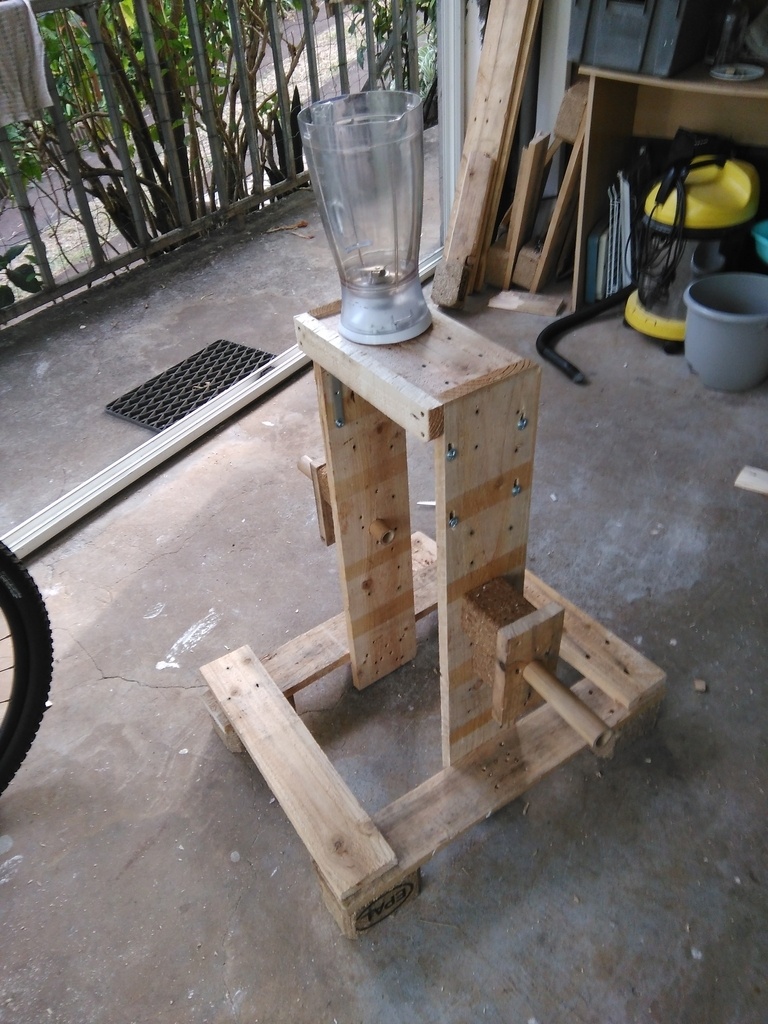 Bonjour Nicolas, La transmission mécanique se fait par frottement sur le flanc du pneus. Effectivement le cylindre noir sur la photo, c'est le rotor du blender agrémenté d'un papier abrasif. Que de la recup !