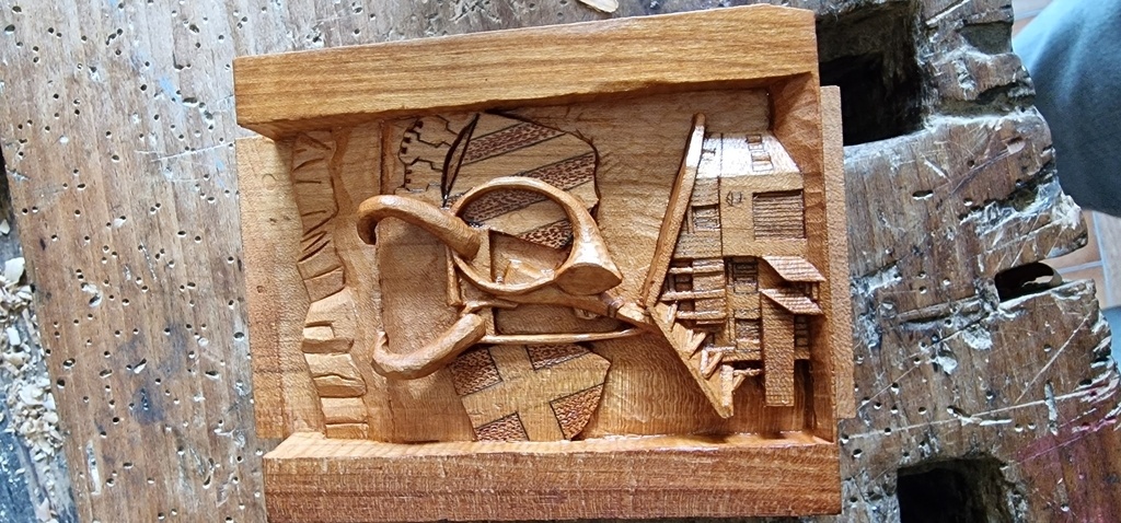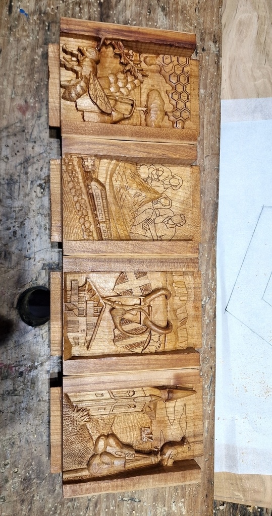 Réalisation d'une stèle avec 5 faces dont 4 sculpté représentant la vie de la personne (la dernière sera sa vie de retraité) ,fait en 5 "carrelets" coupés a 36° avec un tenon aux extrémités pour la jonction avec les socles.