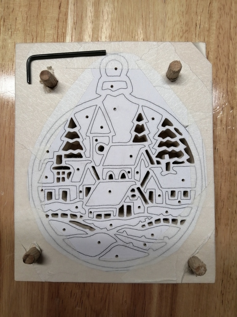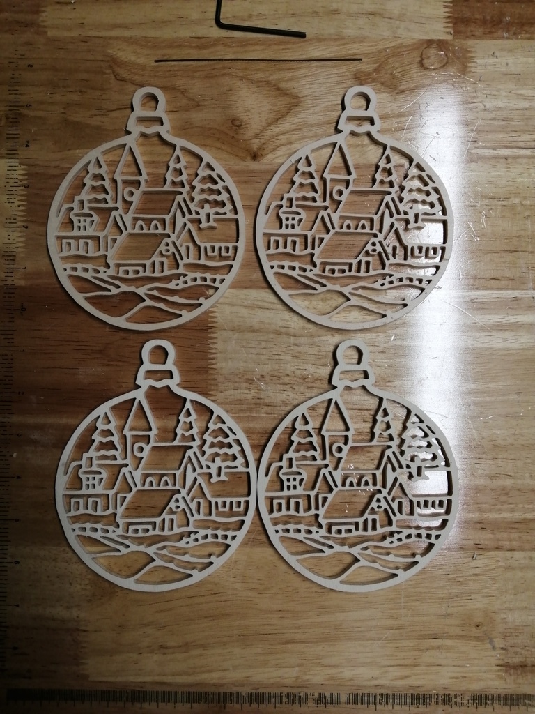 Les 4 boules ont été sciées en 1x en empilant les plaques - CP 5mm de peuplier. Cela permet d'avoir un peu de matière et de limiter la casse
