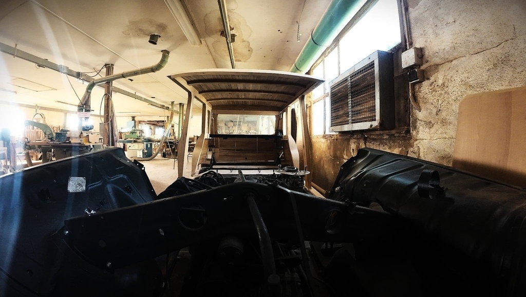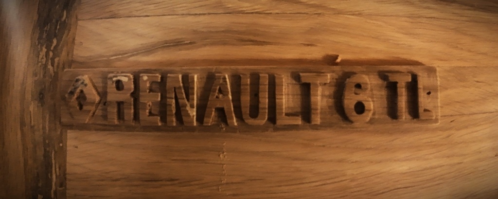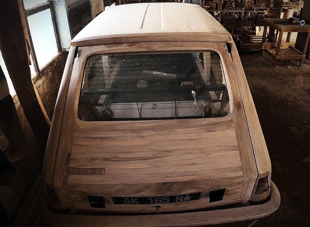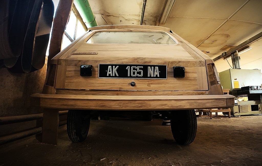 Fabrication en cours d'une reproduction d'une Renault 6tl de 1979 en Chêne.Le châssis de la voiture et le compartiment moteur on était restauré Travail en cours sur la carrosserie en bois