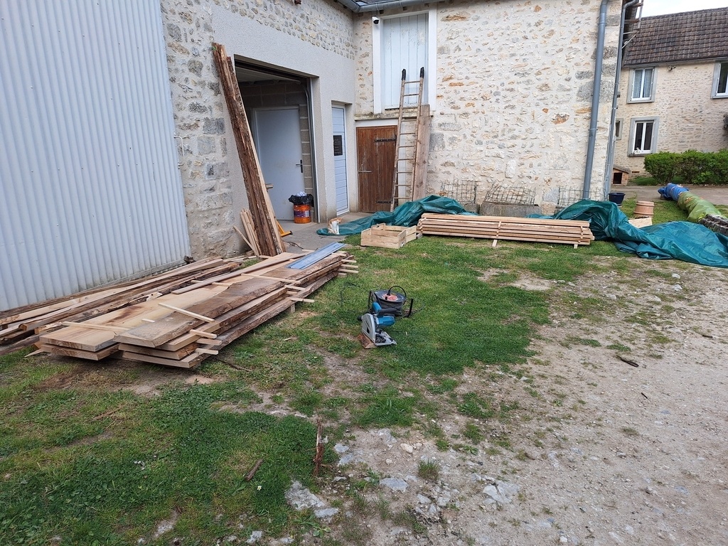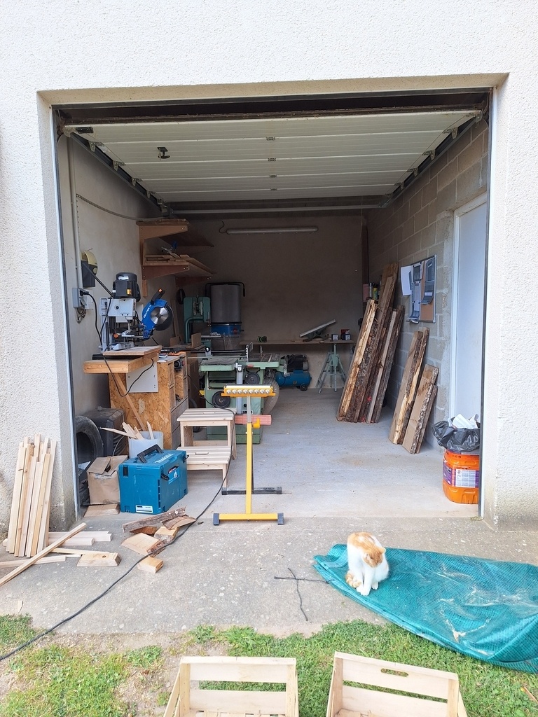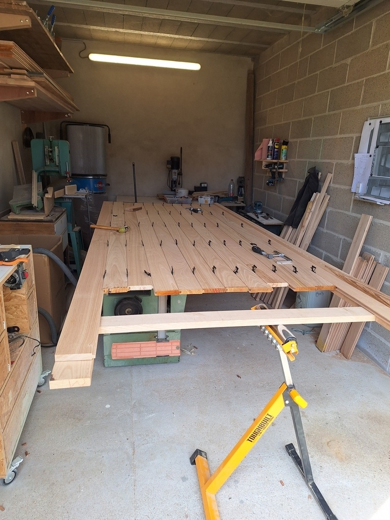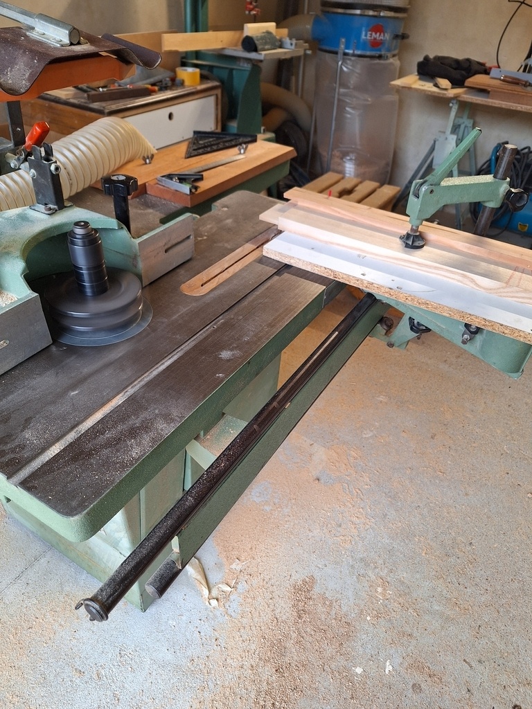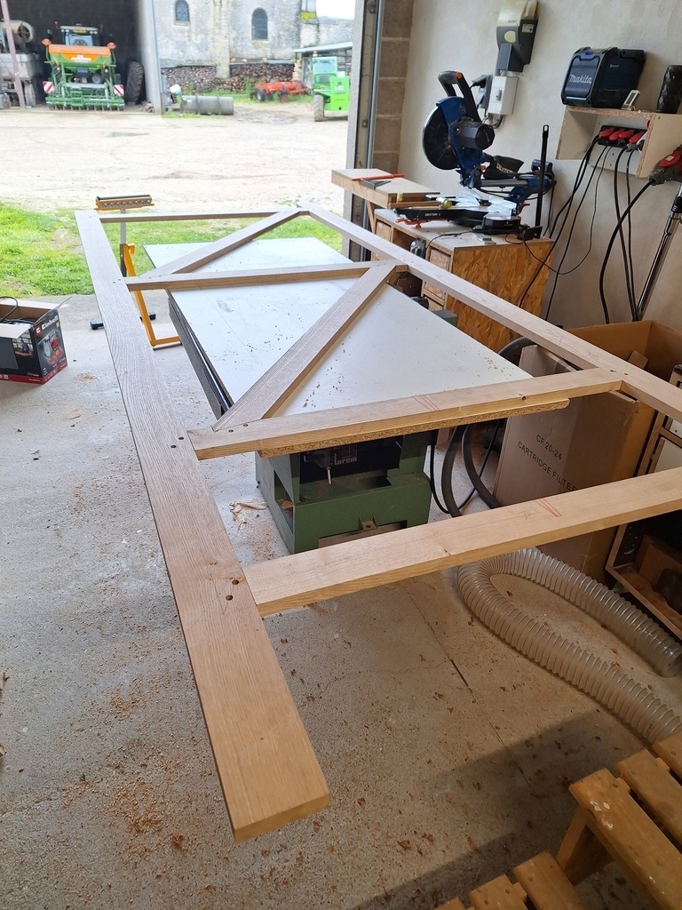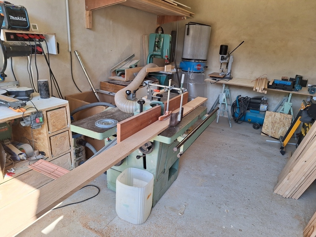 Pour le débit des planches de châtaignier, tout s’est fait à l’extérieur. Ensuite, corroyage et rabotage des pièces, puis retour sous bâche à l’extérieur. Puis toupiage des lames, ainsi que tout ce qu’il était possible de faire tant que la courroie la toupie était installée: jet d’eau, chanfrein, feuillure pour le cadre…