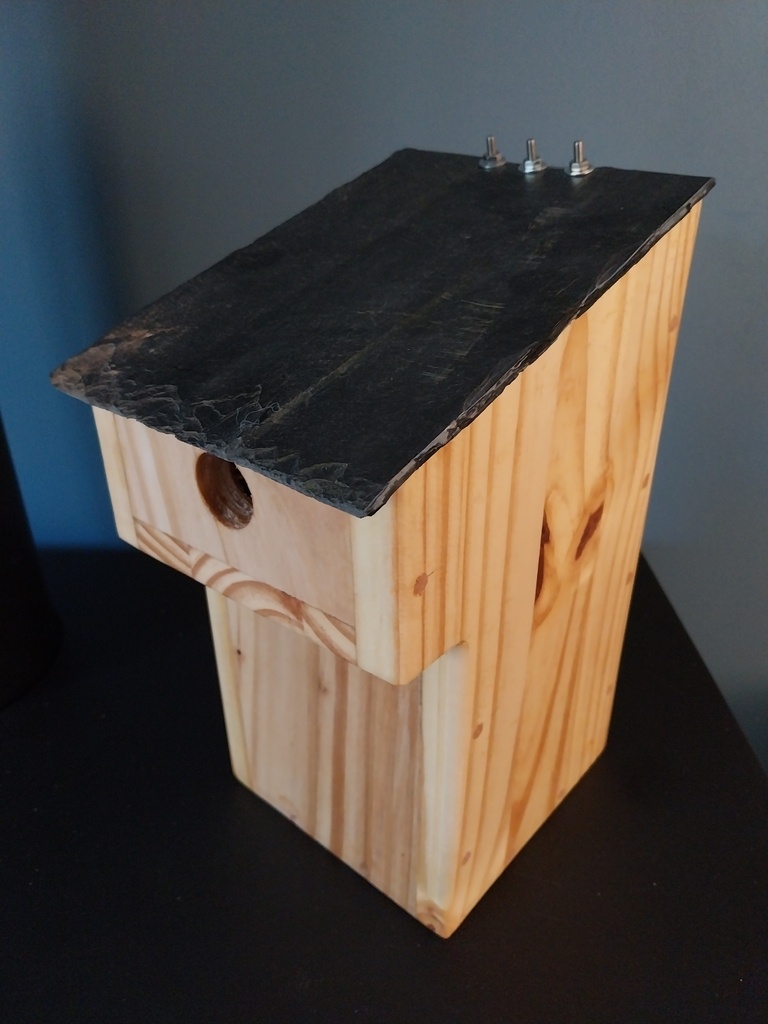 C'est sympa pour les oiseaux de nos jardins. Personnellement j'utilise l'ardoise pour le toit des nichoirs mais sans charnière, juste une pièce de bois collée pour permettre un emboitement ajusté. Le poids de l'ardoise est largement suffisant pour que cela ne s'envole pas.