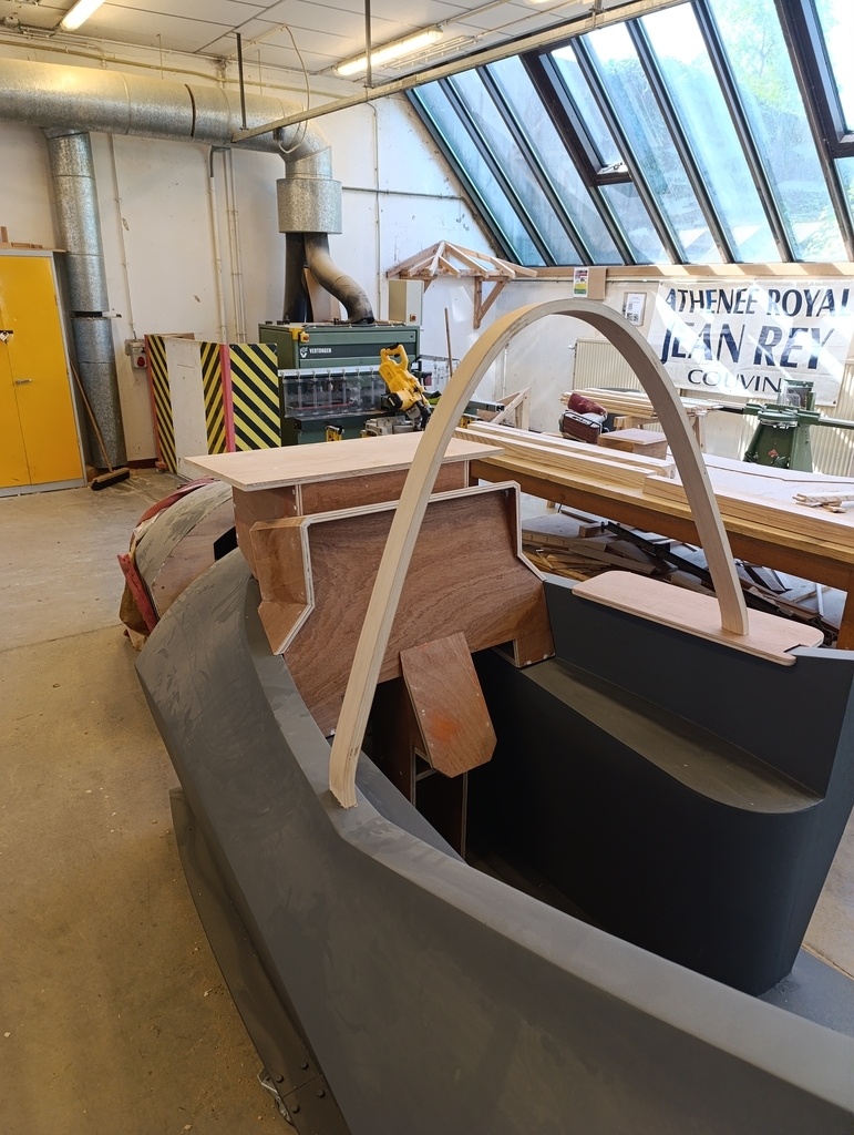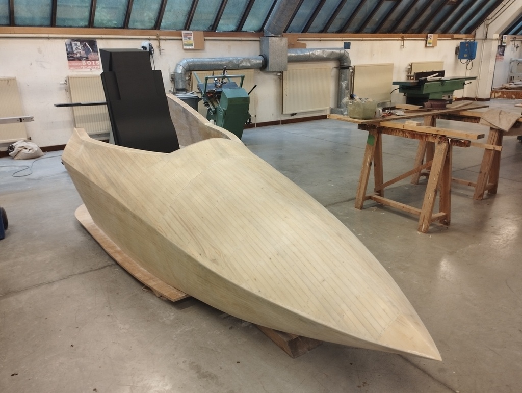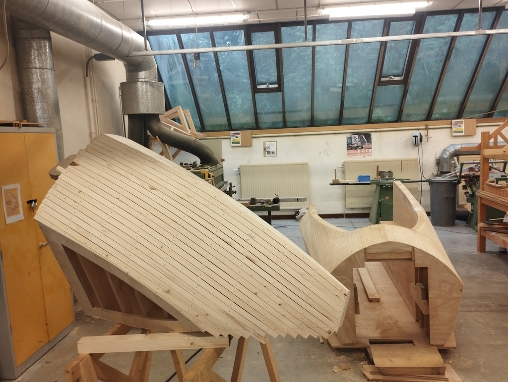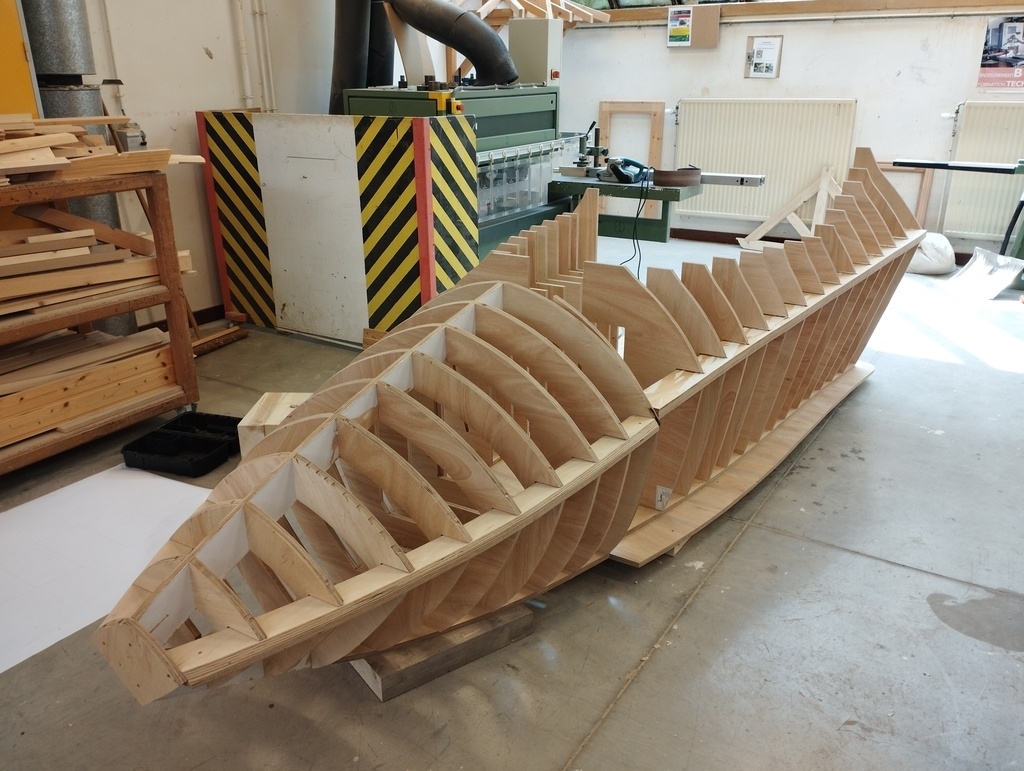 Plan 3D Autocad, programmation et détourage des pièces sur CNC 3 axes, assemblage, rectification des chants irréguliers, lattage, ponçage, fabrication de l'arceau en lamellé collé, pose de la fibre de verre et reponçage. Peinture multicouches par les peintres de la base aérienne.