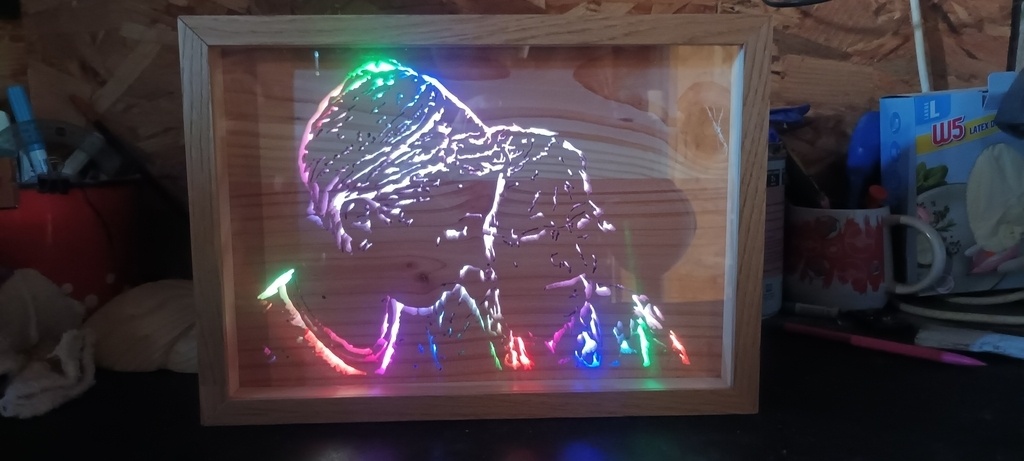 Dans du pin contrecollé épaisseur 20mm, cadre dans du parquet contrecollé, plaque de plexiglas pour protéger l'intérieur de la poussière et d'éventuels chocs, ruban leds adhésif multicolores collé à l'arrière du tableau.