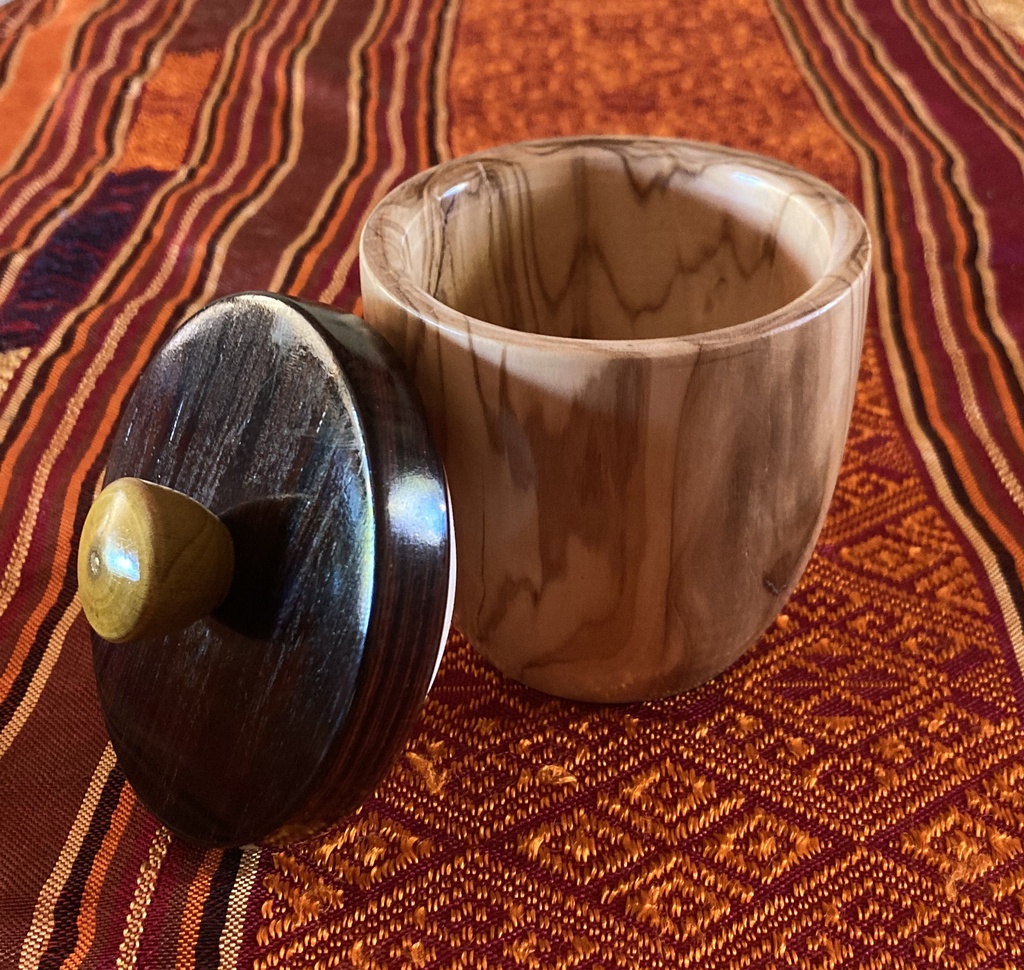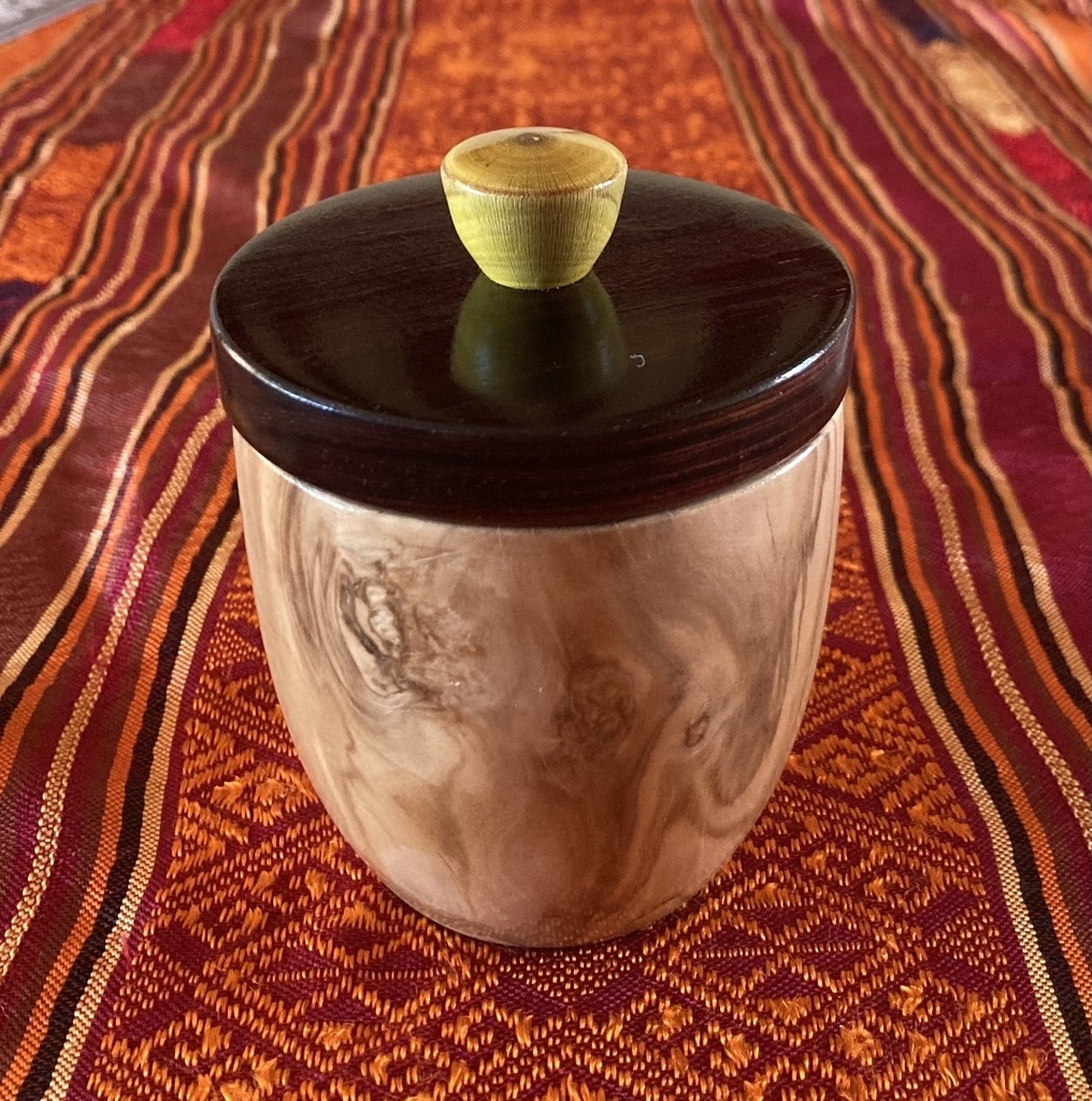 Une boite en olivier. Le couvercle est en cocobolo et le bouton en mahonia (arbuste dont le bois est jaune vif !)