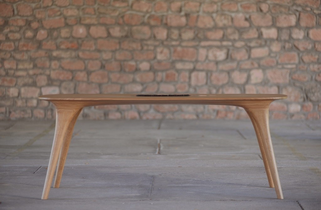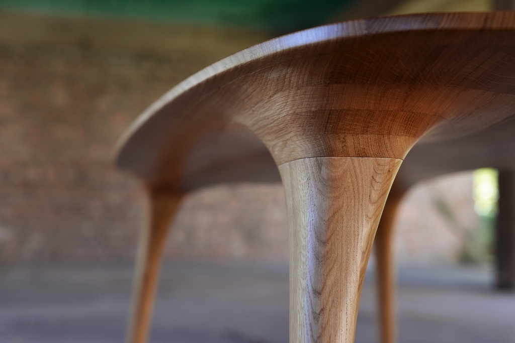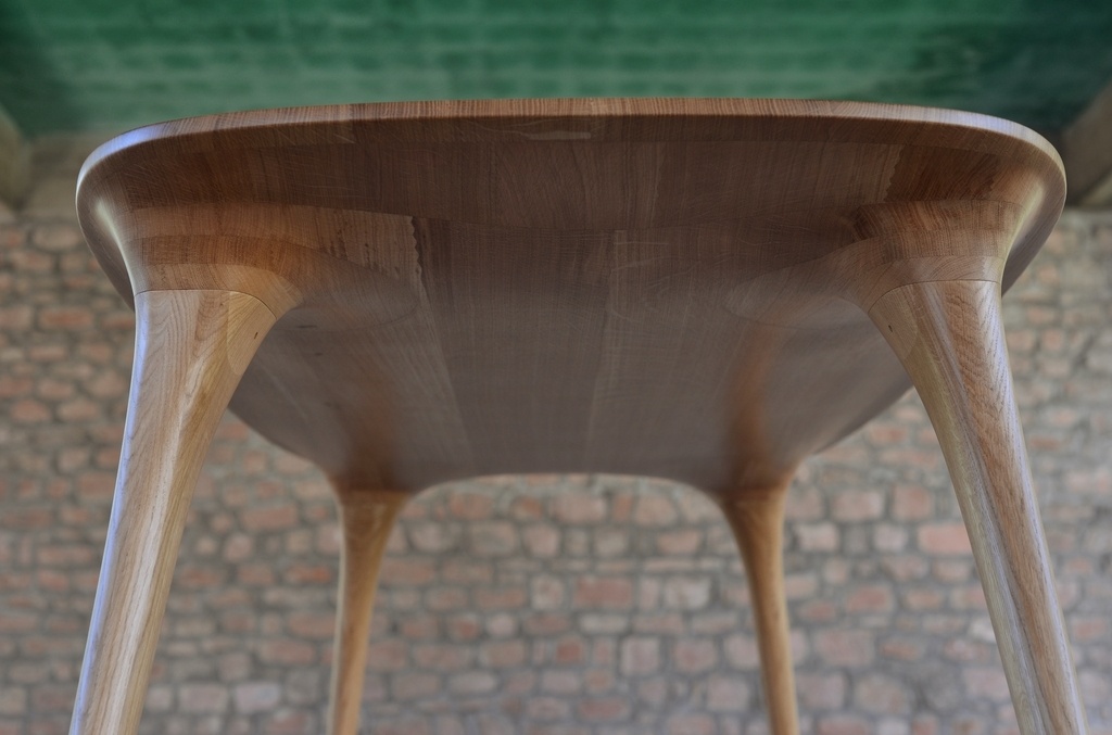 Table en chêne avec piétement démontable ( quincaillerie spécifique ). Modélisé partiellement en 3D et partie bois réalisé entièrement à la main : détourage des masses capables du plateau, collage des couches du plateau à la presse, ébauche et dégrossis à la meuleuse, finition à la wastringue, ponceuse, mini disqueuse.