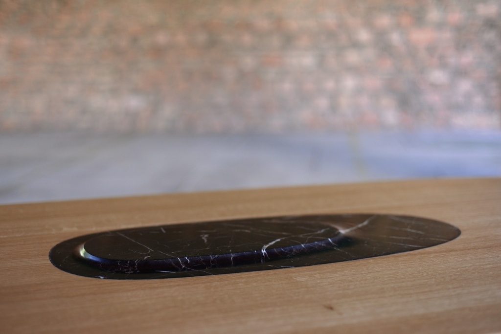 Marbre ( noir st laurent ) taillé à la CNC et fini à la meuleuse par un copain, petit joint de dilatation au silicone noir.