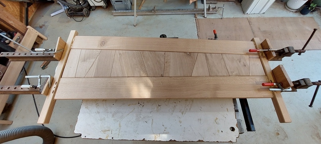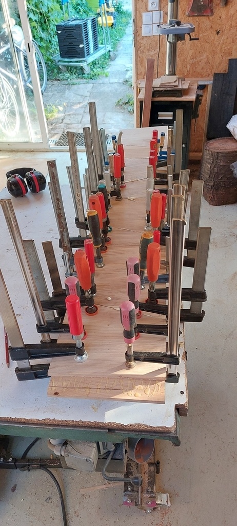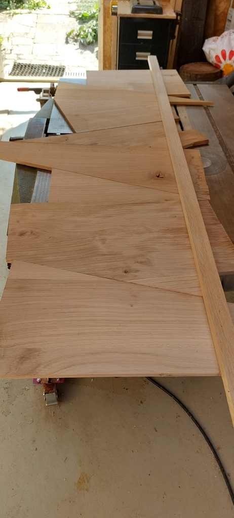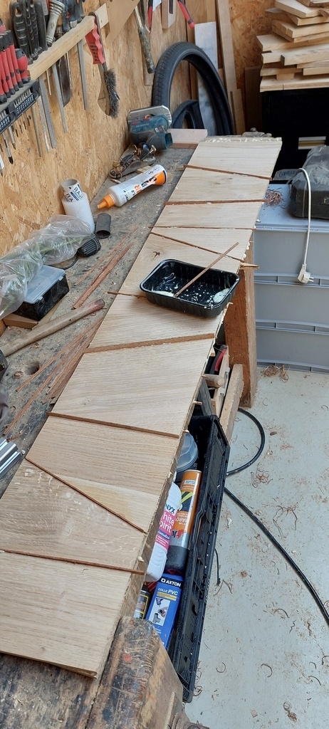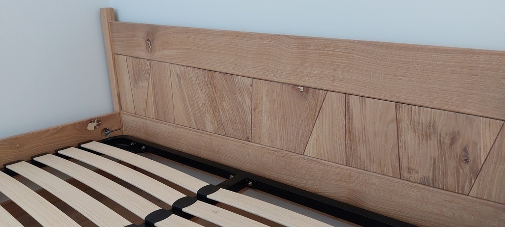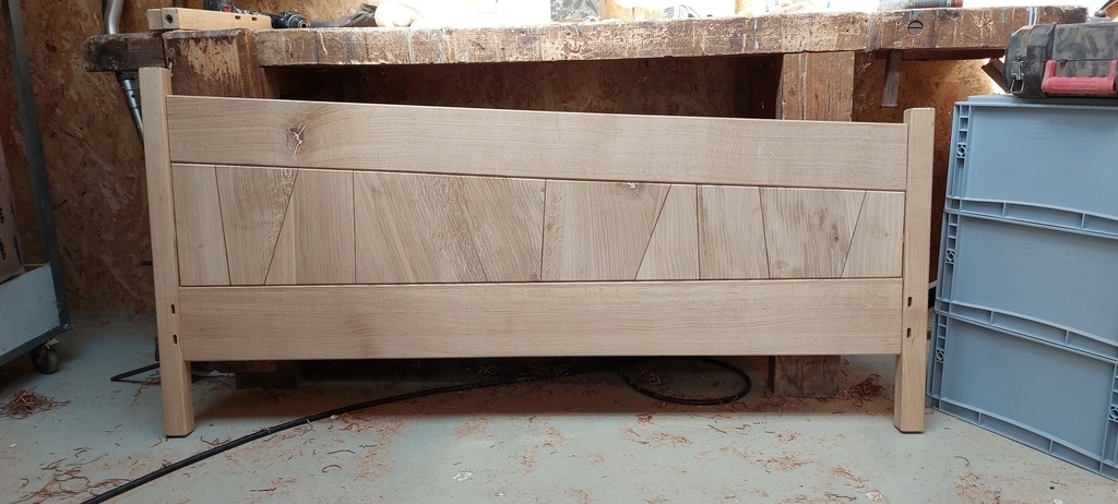 J'ai voulu réutilisé des chutes de mes marches d'escalier pour faire un motif sympa sur la tete de lit + incrustation en noyer pour marquer le motif.