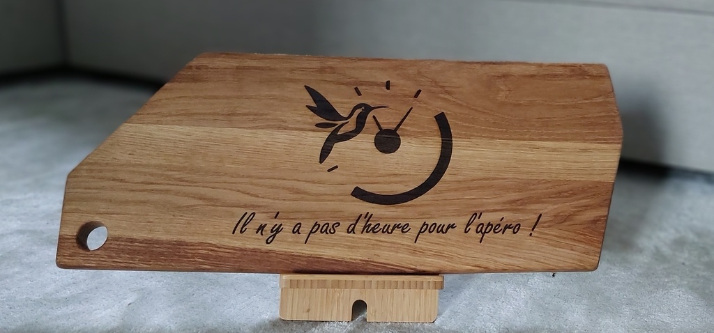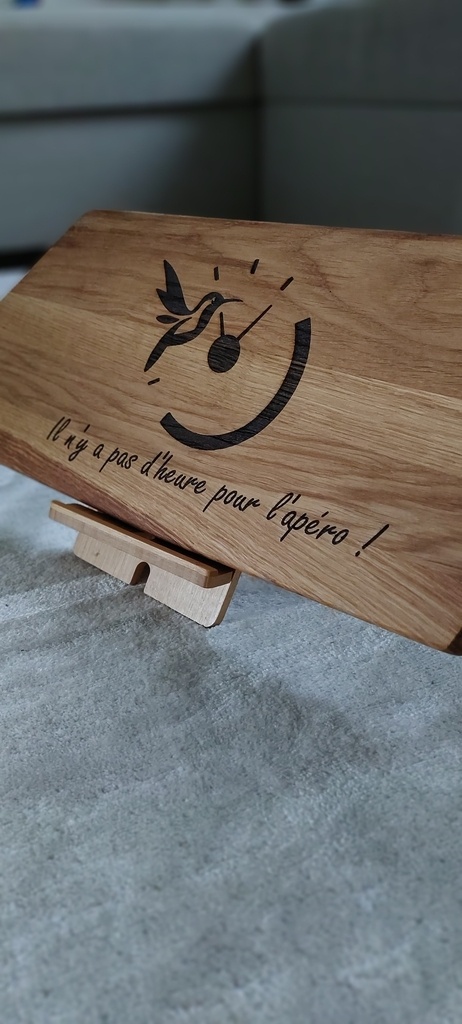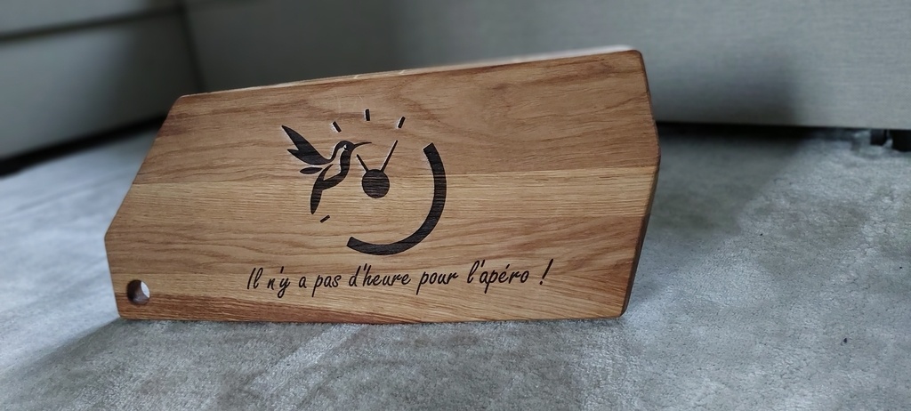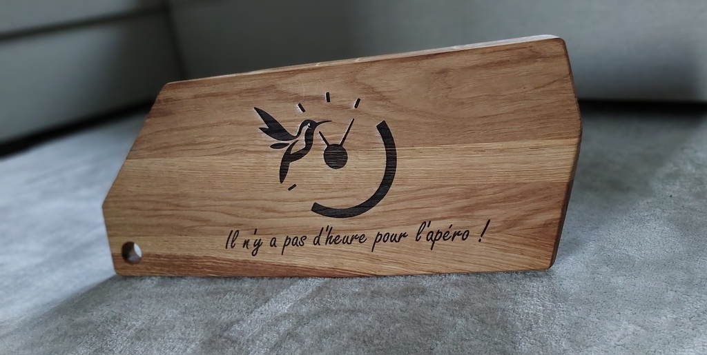 Planche pour les soirées apéritives réalisées en chêne pour une collègue qui quittait l'entreprise. Réalisées en printemps 2024Gravure laser au centre (ma collègue etait fan des horloges en tout genre) Finition huile de lin