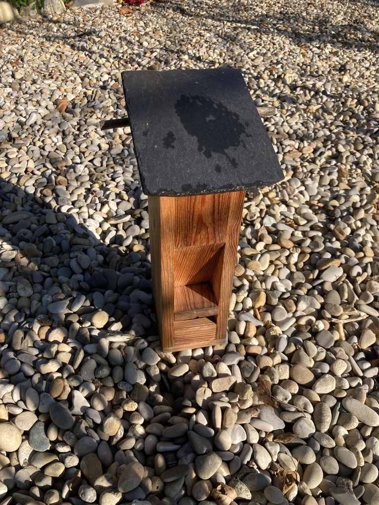 Pour le couvercle, comme il faut nettoyer de temps en temps ou remplir la mangeoire, j'ai opté pour l'ardoise ( durabilité) et poids suffisant pour ne pas s'envoler au premier coup de vent. Le montage est un simple emboitement, aucune charnière.