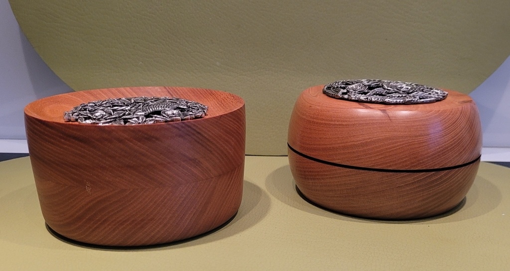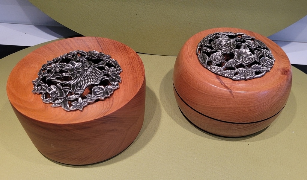 Tournage de deux petits pots à pot-pourri en merisier, l'épaisseur étant insuffisante j'ai dû coller deux Rondelles de ce beau bois pour réaliser ces pièces