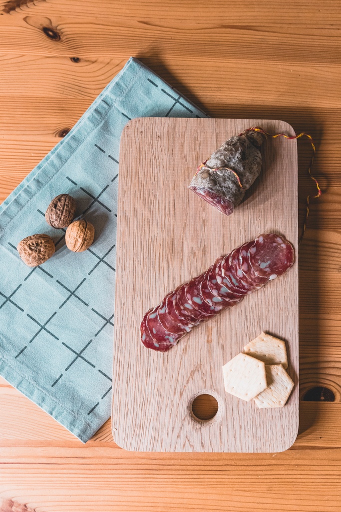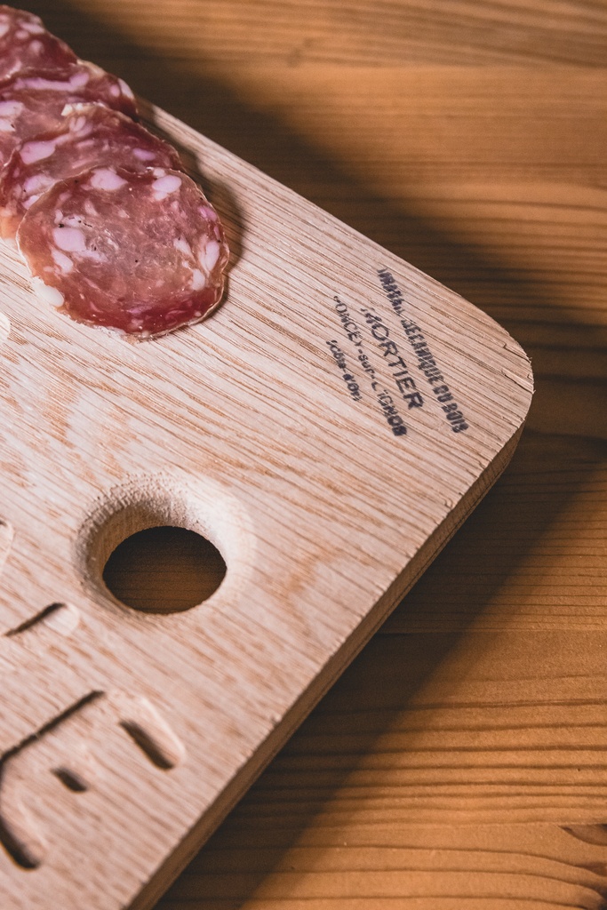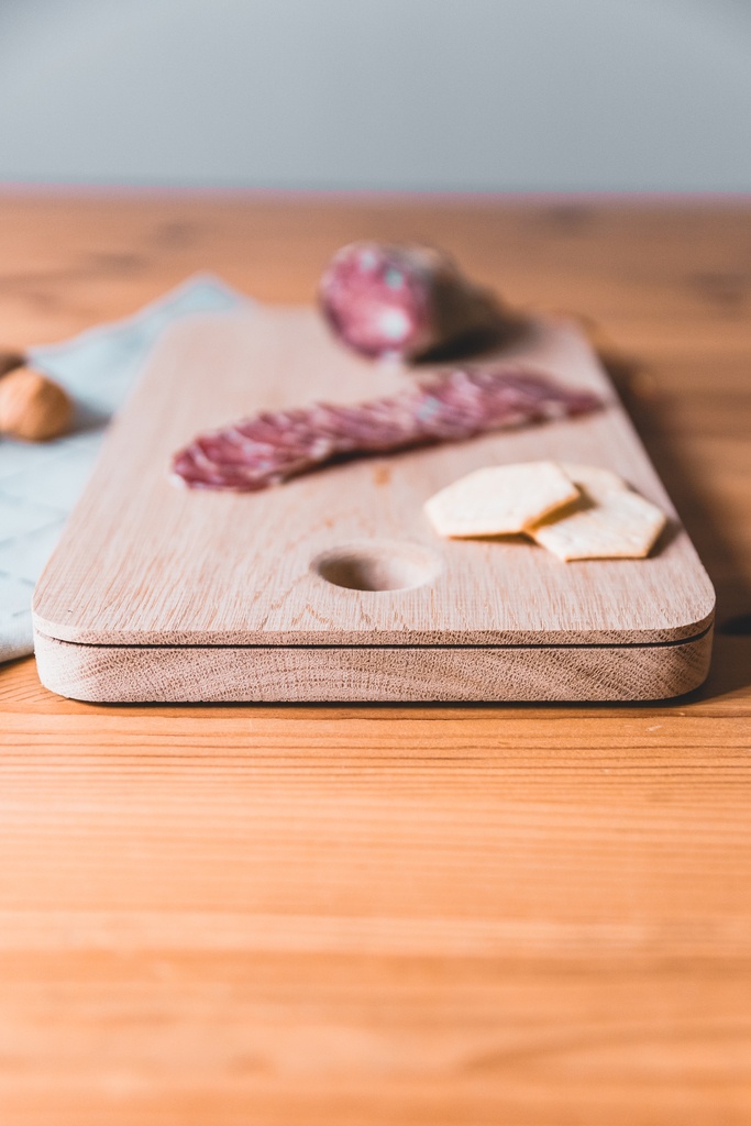 Je m'étais déjà fait une planche à saucisson en mode proto. Un rectangle, un trou pour bien la prendre ou l'accrocher et 2 aimants en insert pour y positionner le Laguiole (pas un franc succès).