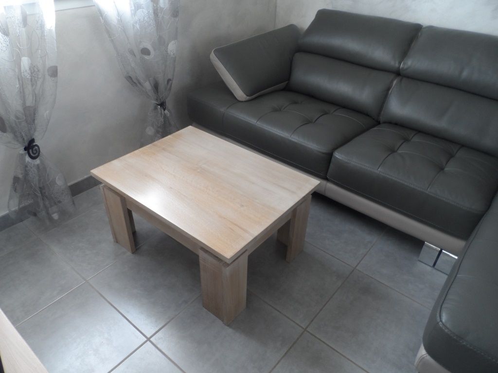 petite table de salon terminée, en chêne finition cérusé blanche vernis satiné.