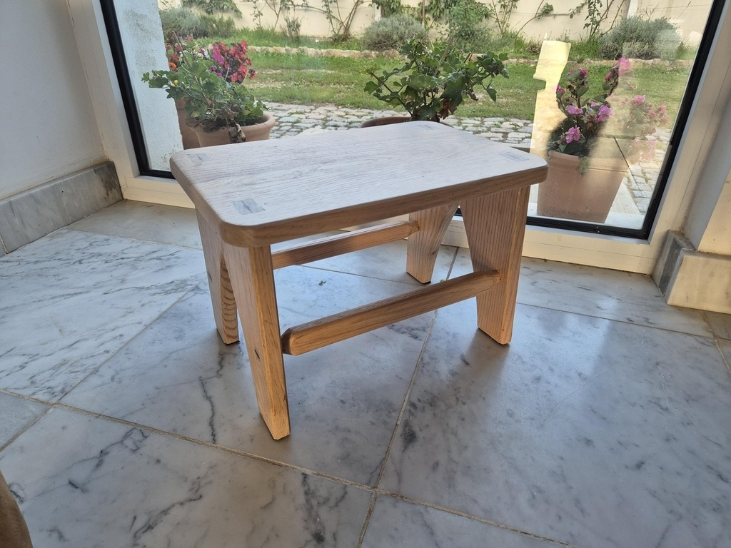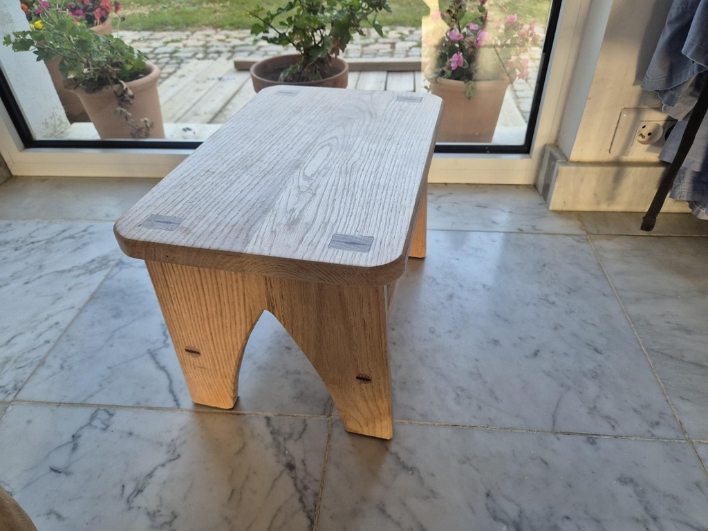 Réalisation d’un marchepied en chêne avec mon fiston de 8 ans, conçu pour permettre aux enfants de participer plus facilement à la préparation des repas.