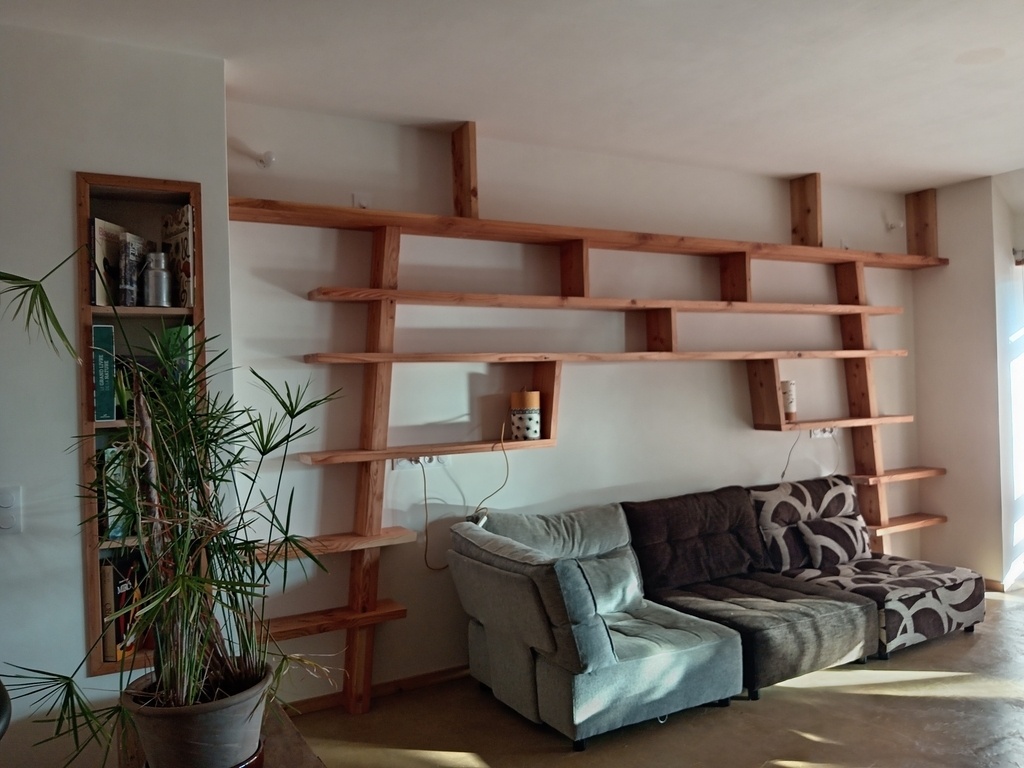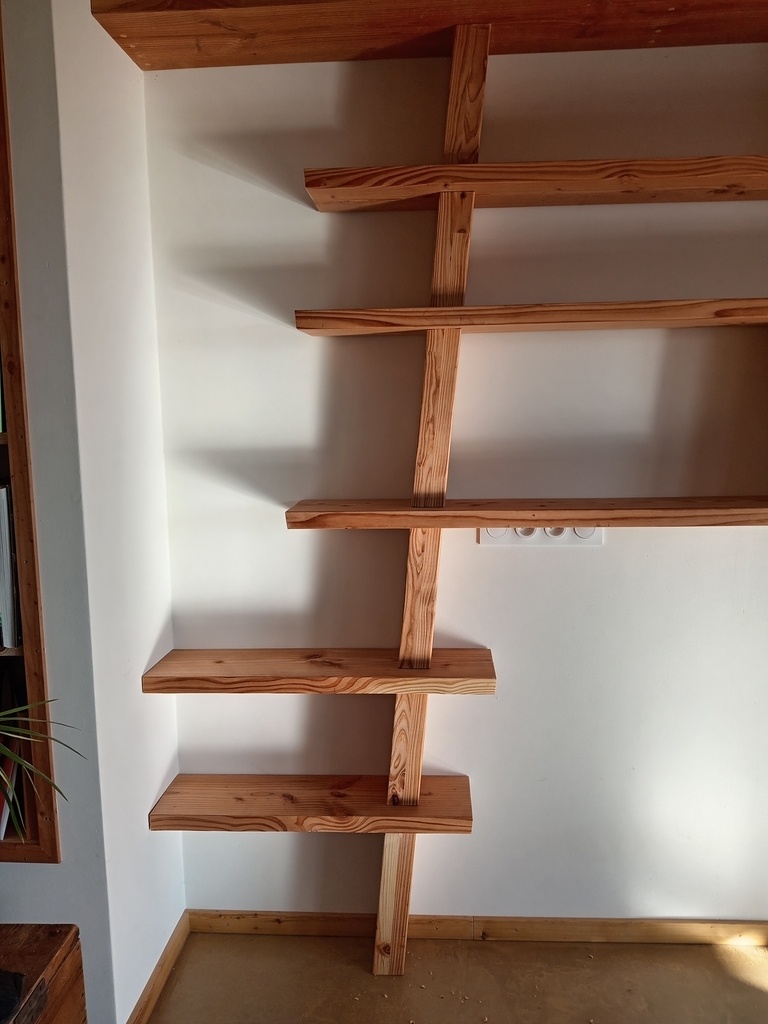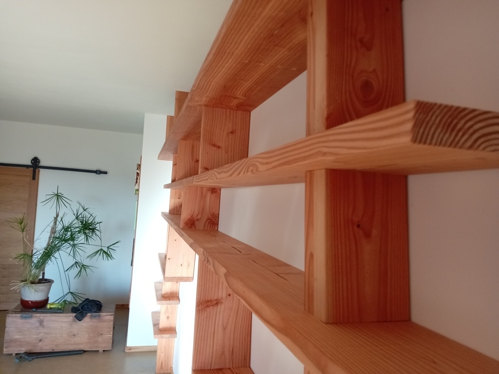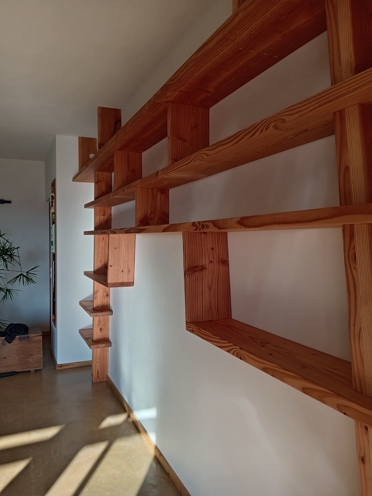 Conception et Réalisation d'une bibliothèque murale en douglas.Design "zen" inspiré des portiques japonais.Assemblage à mi-bois.Dimensions : 4200x2500hx220 mmFinition : Huile de lin